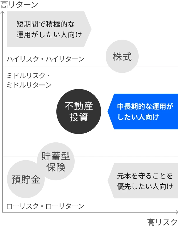 この特徴が他の金融商品と比較したときに、不動産投資がミドルリスク・ミドルリターンと呼ばれている理由です。