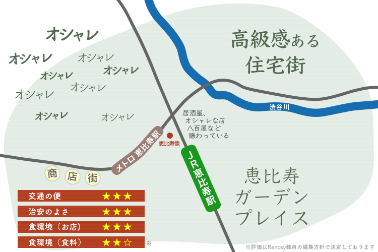 恵比寿の東にある広尾、西側の代官山や中目黒、さらに渋谷や表参道などへも、歩いていくことができる距離です。