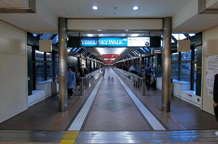 恵比寿駅から南に向かう方面には上り坂があります。駅を降りて西口から南方面へ向かうと坂を登らないといけないのですが、東口から出て恵比寿スカイウォークを通って行くと坂を登らずに南側に行くことができます。