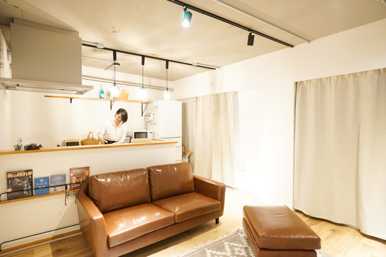 今回おじゃましたのは、ご結婚を機にマンションをご購入、1LDKにリノベーションしてお住まいの、ご夫婦のお部屋。自宅にお仕事のお客さんを呼ぶことを前提に考えたというリビングは、とても居心地の良い空間でした。