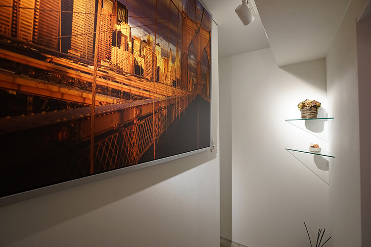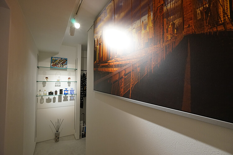 大きなアート作品に、左右それぞれに設けられたガラスの飾り棚に置かれた様々なオブジェ。大人の余裕を感じさせる空間です。