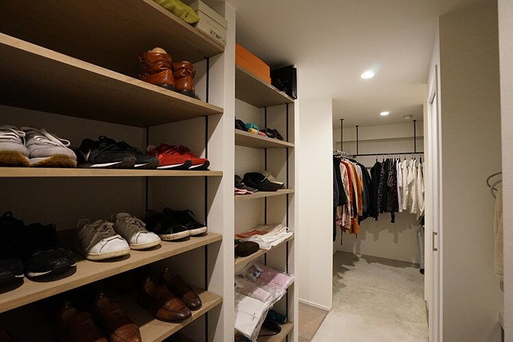 「服や靴をたくさん持っているので、玄関は、それを常に生活の一部に感じられるような、自分の好きなものに囲まれた空間にしたくて。気分と天気によって置き方を変えたり。入る時は、その時のコンディションでどちらを使うか決めますね。右のほうが多いかな」