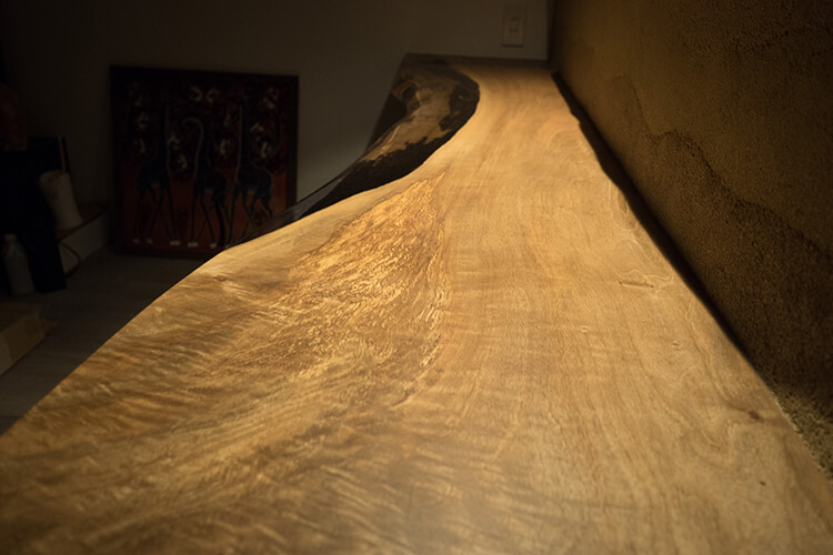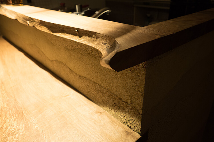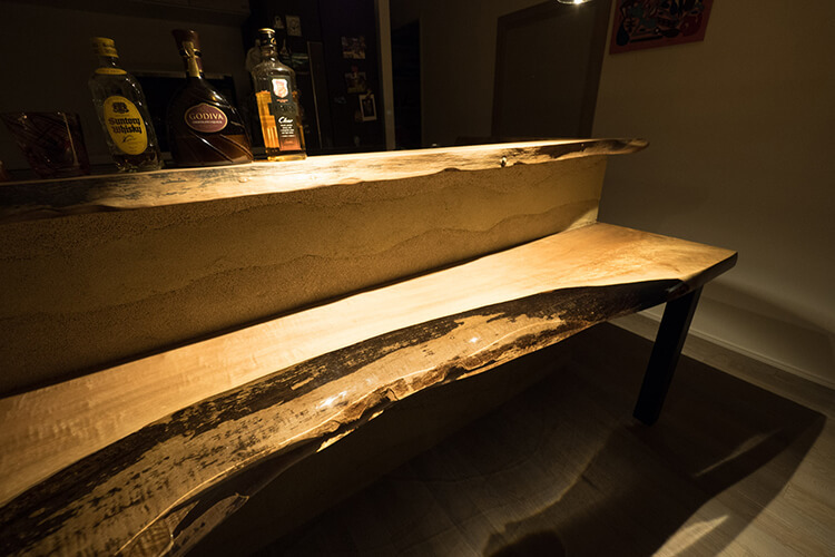 こちらは、一枚板テーブルを中心にした家具を扱うATELIER MOKUBAで、気に入った木を選び、サイズを合わせて加工してもらったもの。たまたま、お風呂やトイレを選ぶために見に行ったショールームで、ATELIER MOKUBAの期間限定の展示販売に遭遇、一枚板の魅力に惚れ込み、これをカウンターテーブルにすることを決めました。