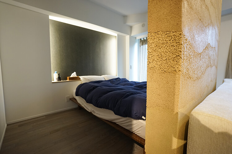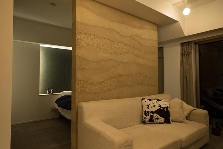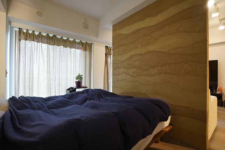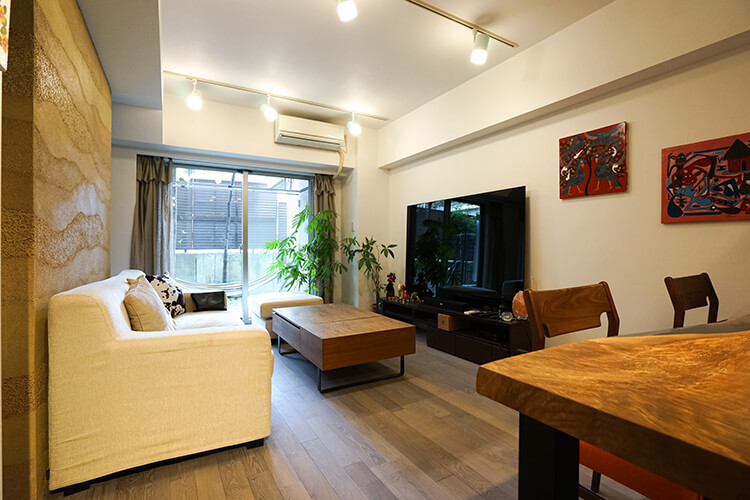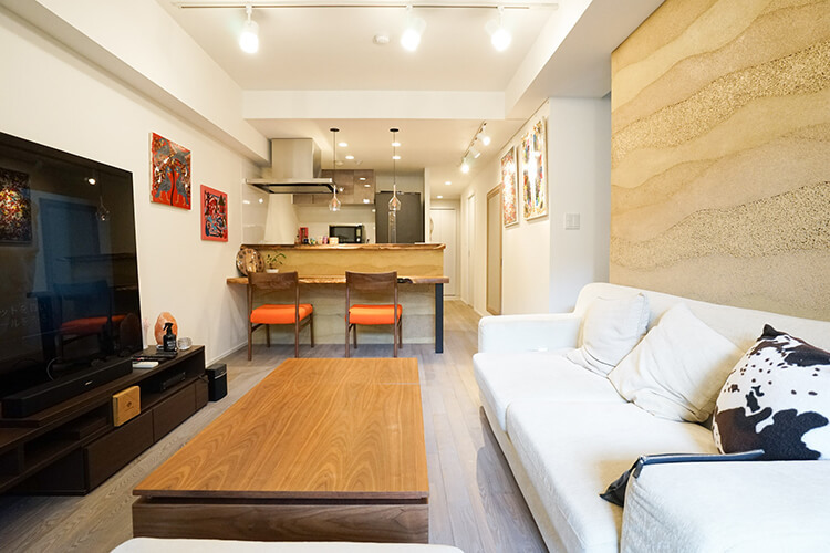 「いろんな不動産を見てきたけど、今まで見た中で一番かっこいい部屋になったと思ってます」と自信満々の言葉どおり、どの部分にも手を抜かず、一番気に入ったものだけで作り上げられた空間は、まさに「一点モノ」。無垢の一枚板テーブル、版築の壁、そしてたくさんのアートと、どこにもニセモノがない大人の部屋でした。