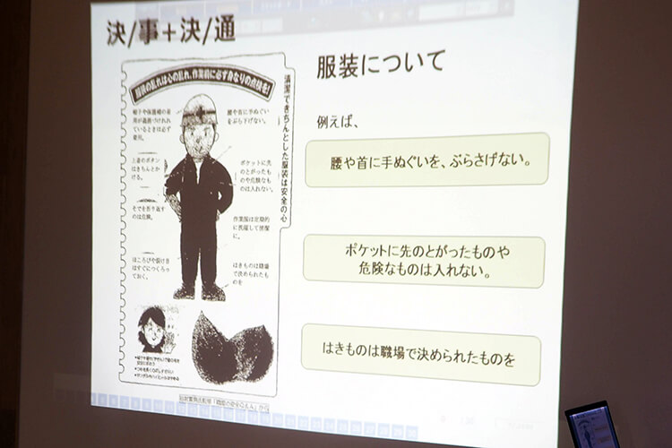 決められた服装についても再確認。手ぬぐいの巻き方、靴の履き方によって、事故につながった事例を交えて、正しい服装の重要性を確認しました。