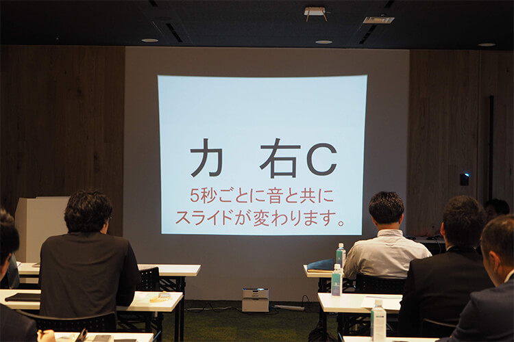 5秒ごとに画面が切り替わり、問題が表示されます。参加者の手元に配られた回答用紙に、指示された場所をマークしていくワークです。