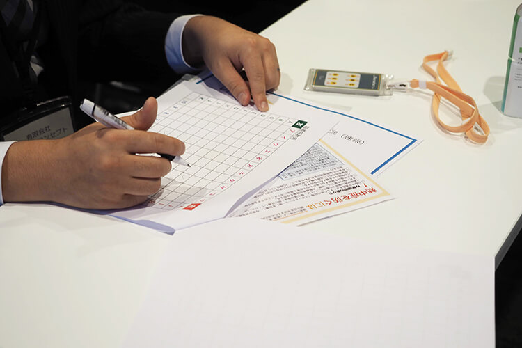 ワークは2回実施され、1回目は指差呼称なしでただ目でみるだけで回答。2回目は画面の指示とともに森さんが問題を読み上げ、参加者も記号を声に出しながら回答を記入します。