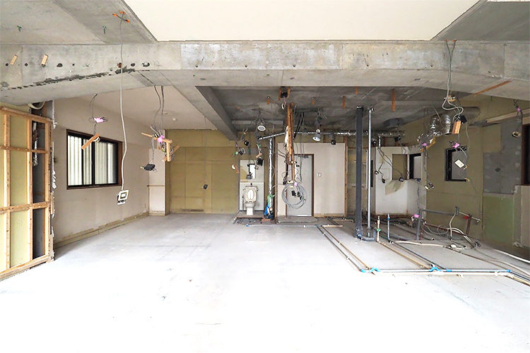 天井と梁、壁とコンクリートの床(スラブ)が露わになった状態、スケルトン。電気、水道、ガスの線や配管に、使える断熱材と、マンション共有部分は残っています。