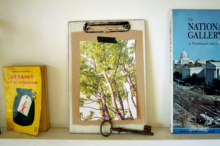 上の例では、自然の樹木の写真なのでなじみのよいクラフト紙を台紙にしています。クール&モダンに見せたければ黒い台紙で金属製のメモボードにしたり、ヨーロピアンなカフェのイメージなら英字新聞などを台紙に選んだりと、インテリアや写真の雰囲気に合わせて変えてみましょう。