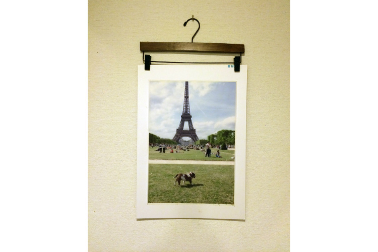 普段洋服を吊るすためのハンガーを使って写真を飾るアイディアです。ハンガーのサイズに合わせるために、四つ切りもしくはA4サイズくらいのサイズでプリントするとバランスが良いです。写真用紙だけだとぺらぺらした感じになるため、できればひと回り大きい厚紙を用意して写真を貼るとしっかりと安定します。