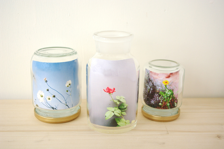 使っていないビンがあるなら、写真を入れてたくさん並べてみるとかわいいです。中に入れる写真はすべてモノクロにしたり、被写体を統一させたりするとよいでしょう。上の例ではふだん何気なく撮っているお花の写真でまとめました。口径が大きいビンに入れる場合は、横長の写真を選びましょう。