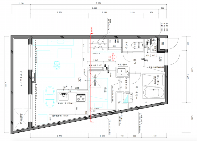 なのですが、設計者を悩ませたのは、ちょっと不思議な形の間取り。全体に台形で、特にメインのダイニングキッチンの部分にまっすぐのカウンターキッチンをつけると、なかなかのデッドスペースが生まれてしまいます。