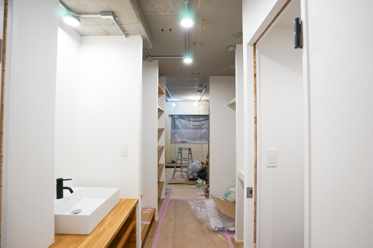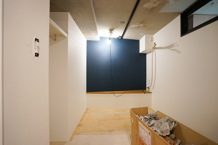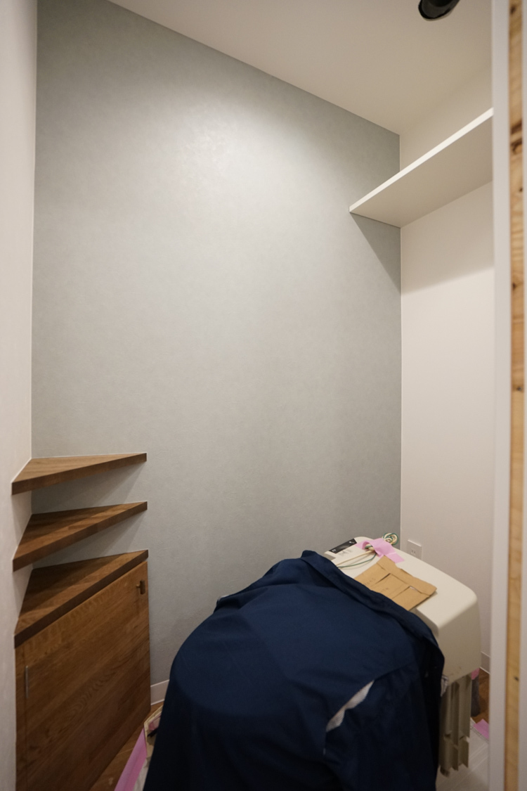 まだ工事中の状態ではありますが、寝室にはオープンなクローゼットがつけられていたり、トイレには動線を邪魔しない三角形の造作棚があったり、デッドスペースを生まないための工夫が随所に見られるお部屋です。