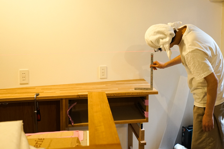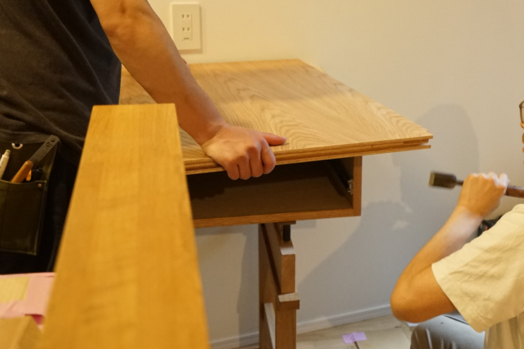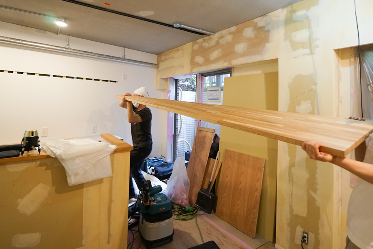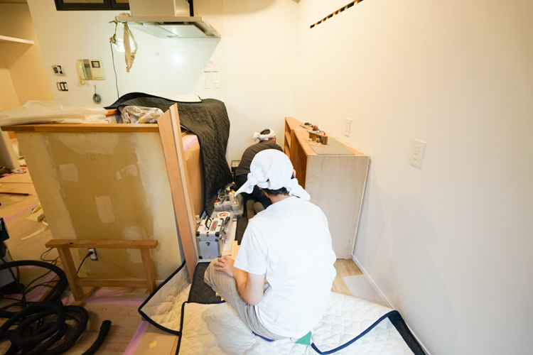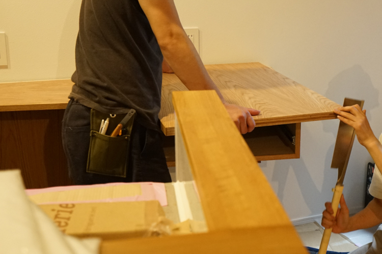 完成してから納品する普通の家具なら、もちろんサイズはあらかじめ決まっているのですが、今回は、できあがった床や壁、キッチンカウンターなどに合わせて、現地で最終的な寸法を決める必要があります。
