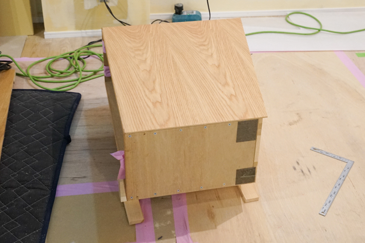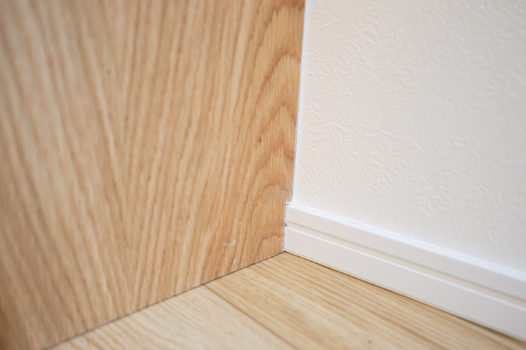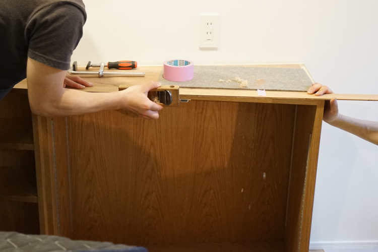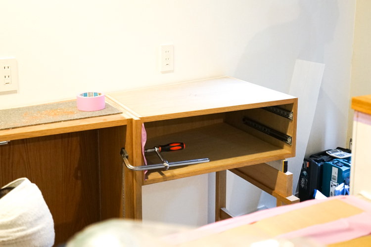 ホワイトオークの突板合板と無垢材で構成された今回の食器棚。伺ったときは、棚の最下部に突板を貼る作業の真っ最中でした。