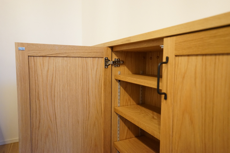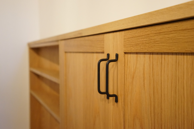 オークの床にあわせて作られた、オークの食器棚。取っ手や、上部の棚受けにはお部屋の他の部分にもところどころ使われている「黒」をあしらうため、アイアンの素材が。「このお部屋にあわせて作ってもらった」特別感を感じます。