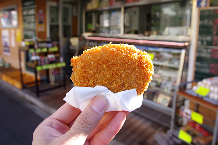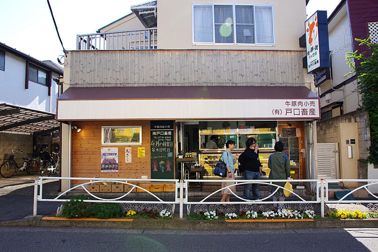 ちょっと小腹がすいてきたところで、岩本さんがお気に入りのお肉屋さんを教えてもらった。住宅街にある戸口畜産の創業は1966年、小売り以外にも飲食店や保育園などに卸している老舗である。その確かな品質を求めて、遠方からわざわざ来る昔ながらのお客さんも多いとか。