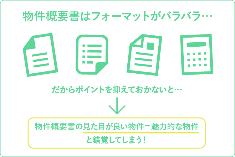 投資用マンションを購入するときは、複数の物件を比較することが一般的です。フォーマットがバラバラだと物件概要書の見た目の良い物件が、良いものに見えます。しかし、読み方のコツを知っていればイメージに左右されず、純粋なデータで「買いかそうでないか」を判断することが期待できるでしょう。