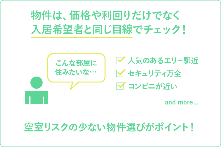 「同じような感覚で入居希望者が重視するのは何か?」を意識しながらデータを読み込んでいきます。たとえば、「この間取りは使いにくくないか」「セキュリティはしっかりしているか」「コンビニがあるか」といった具合です。もし、入居者希望者が気にしそうなことが物件概要書に入っていなければ、メモしておいて後で確認しましょう。