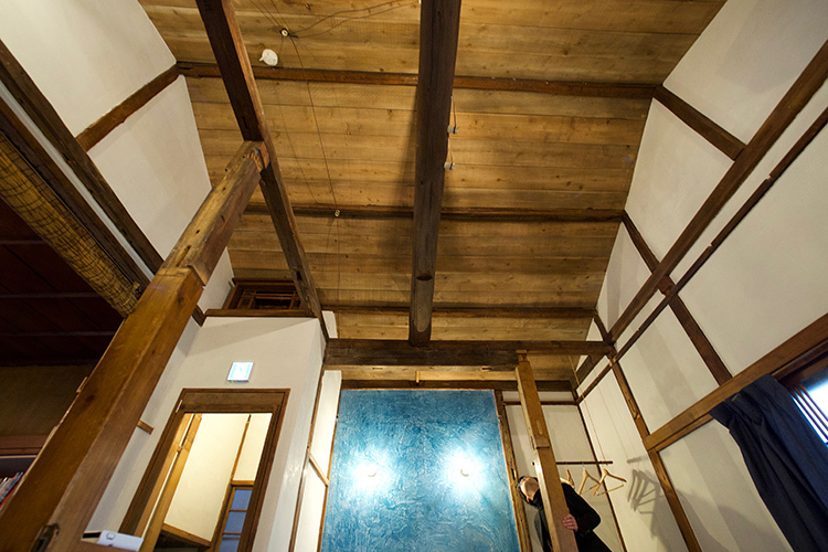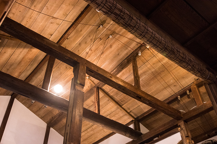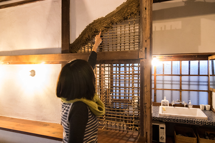 「壁を抜くのを途中で止めているのは、この壁の来歴を示したかったからです。剥き出しになっている竹組みは、土壁の下地に使われる竹木舞(たけこまい)とよばれるもので、もともとはその両側に錬った土と藁スサが10センチほどの厚みまで塗り込められていました。今回のリノベーションではその上に漆喰を塗っています」