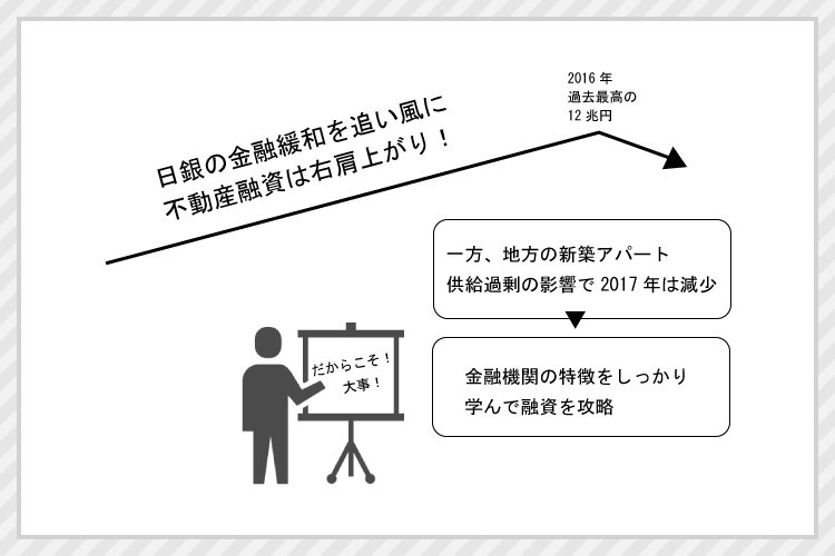 その一方で不安材料もあります。2017年単体で見れば、金融機関からの不動産融資が減少しているのです(前年比5.2%減)。これは近年、地方の新築アパートの過剰建設問題がクローズアップされ、不動産投資に対する審査基準を厳しくしている金融機関が出ている影響だといわれています。
