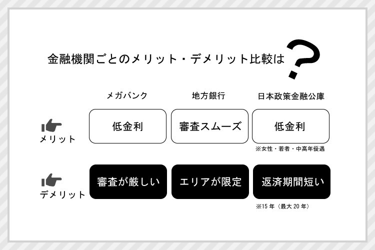 金融機関の選択は、不動産投資の重要なポイントです。それによって、返済期間や利率が変わってきます。ここでは、代表的な金融機関であるメガバンク・地方銀行・日本政策金融公庫の特徴を解説していきます。