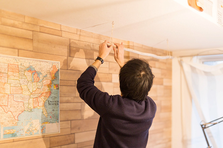 「木の突っ張り棒を天井から床にかけて突っ張らせ、そこに板を打ち付けると、新しい壁になります。最近流行ってますね。どこでも手に入りますし金額も安いですし。賃貸のおうちには使いやすいですね」