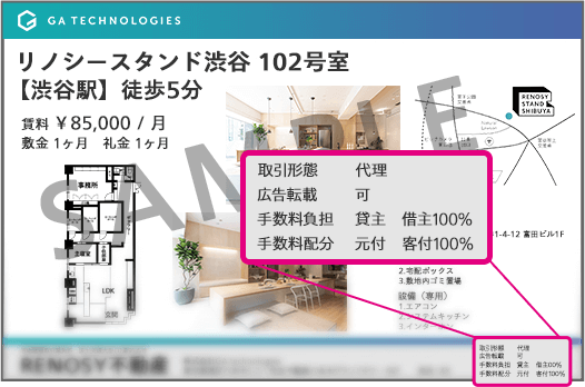 1つ目は主に東京で一般的な「当方不払い」とよばれる支払システムです。当方不払いの場合、貸主は仲介手数料を支払わず、借主が手数料を負担します。不動産を借りる際にみかける「マイソク」には下記のように手数料負担は「借主100%」となっています。