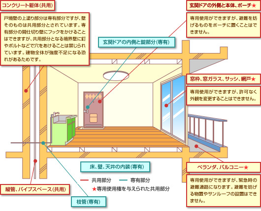 玄関ドアの内錠や内装は専有部分、窓サッシは共用部分