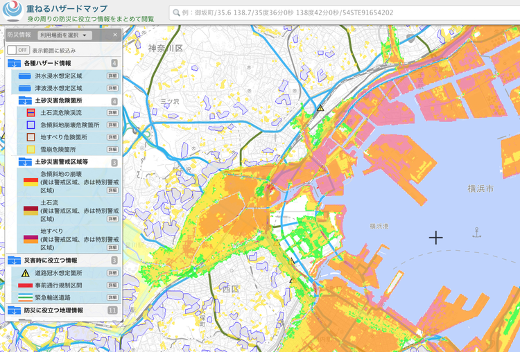 2. 重ねるハザードマップ(国土交通省):津波、洪水、土砂、火山に対するリスク