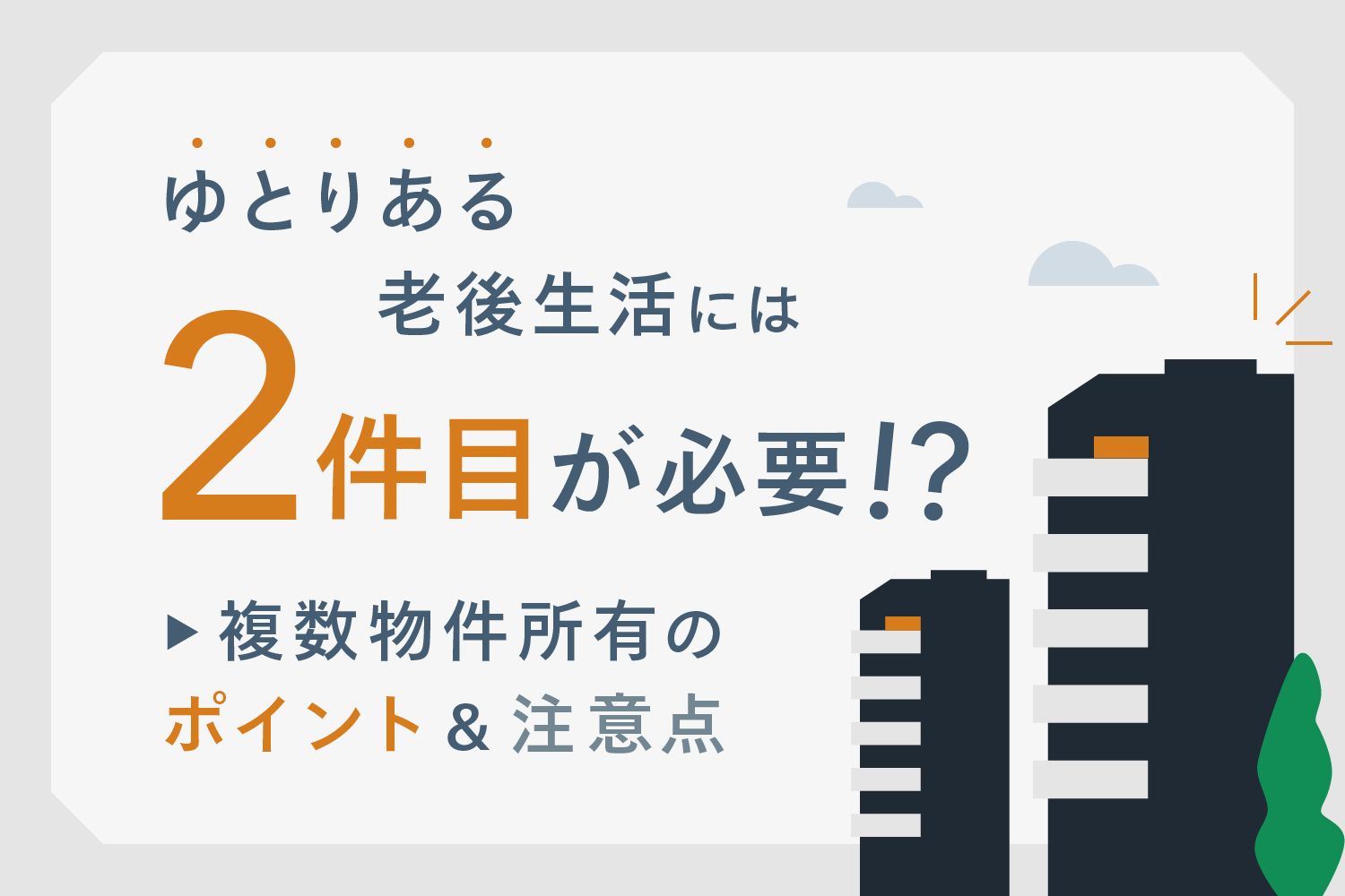 あなたが理想とする「老後の生活レベル」はどのくらいでしょうか。せっかく不動産投資をするなら、「1件」よりも「複数物件」を所有することが、ゆとりある生活を送るために有効だと感じられるのではないでしょうか。