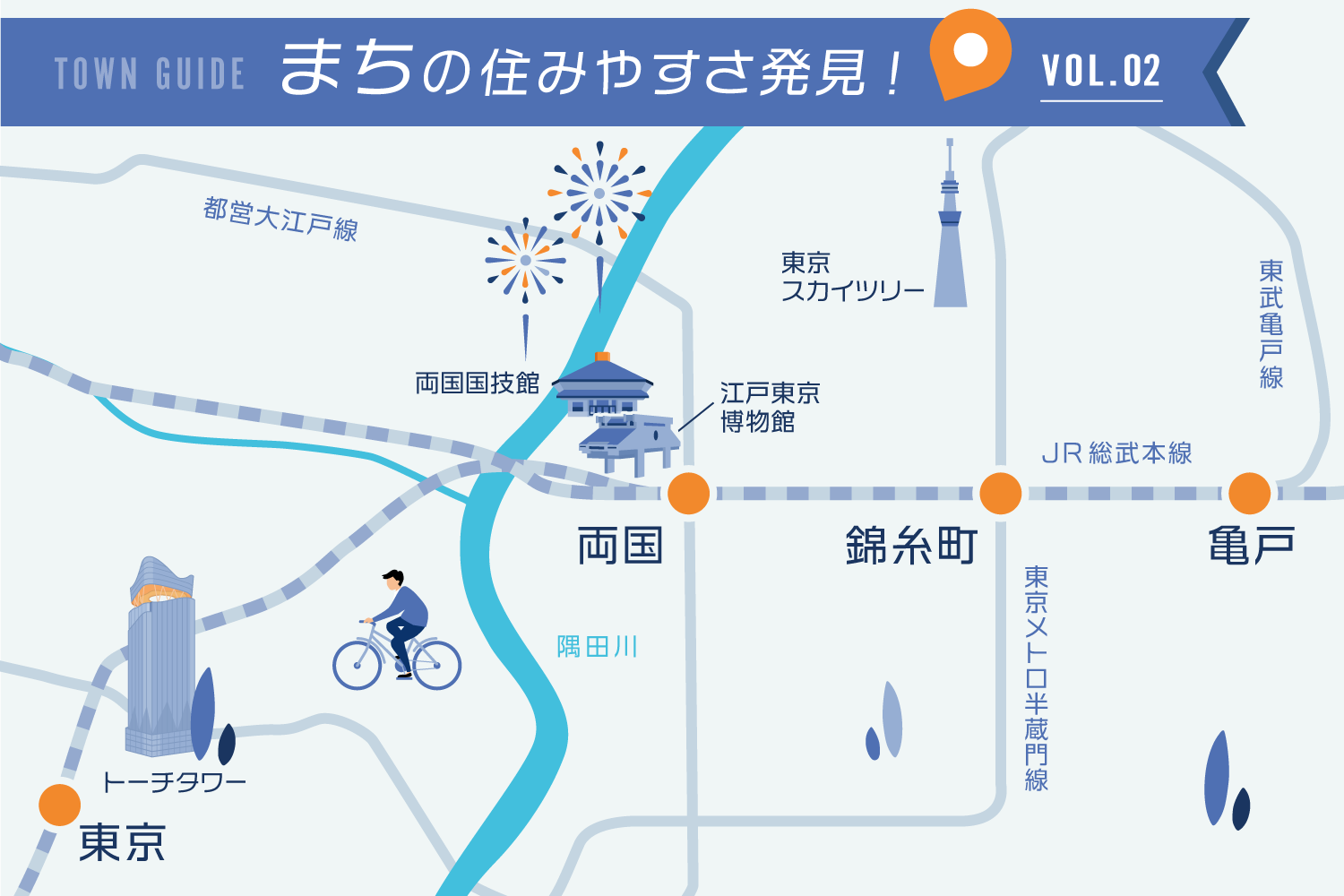 両国、錦糸町、亀戸と、どのまちも、一人暮らしはもちろん、二人暮らしや家族連れ、年齢を問わず、地元に根付いた文化とともに豊かな暮らしができる、住み心地のよいまちです。