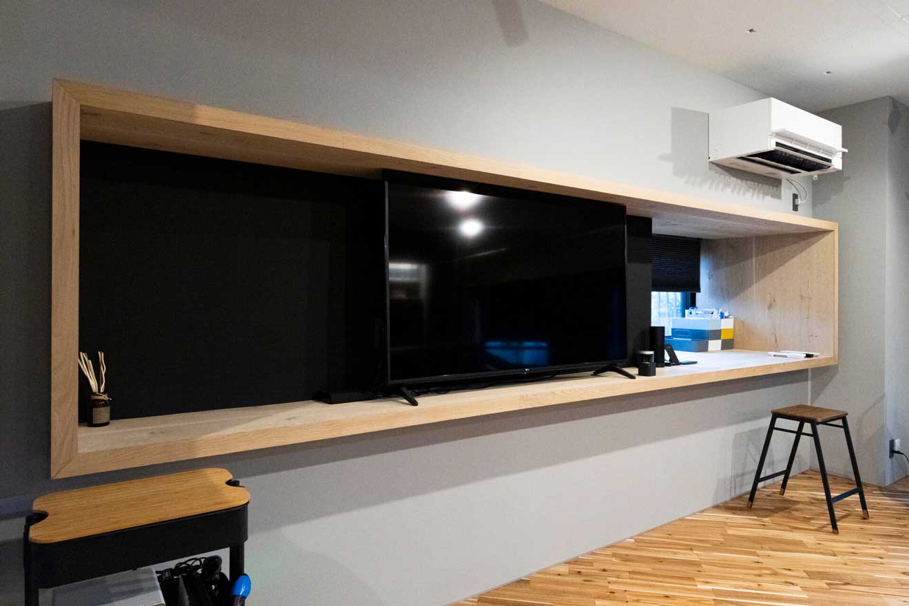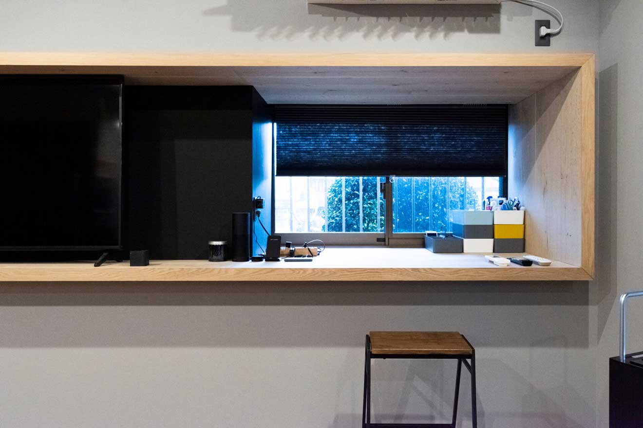 右の方には出窓があります。ここ一体の空間も木枠で囲って、意味のあるつくりに。