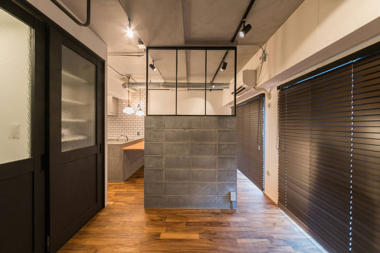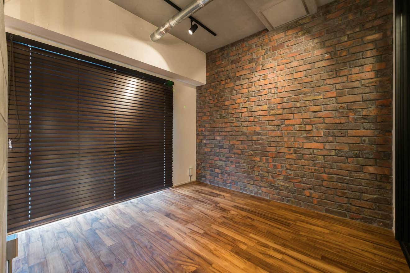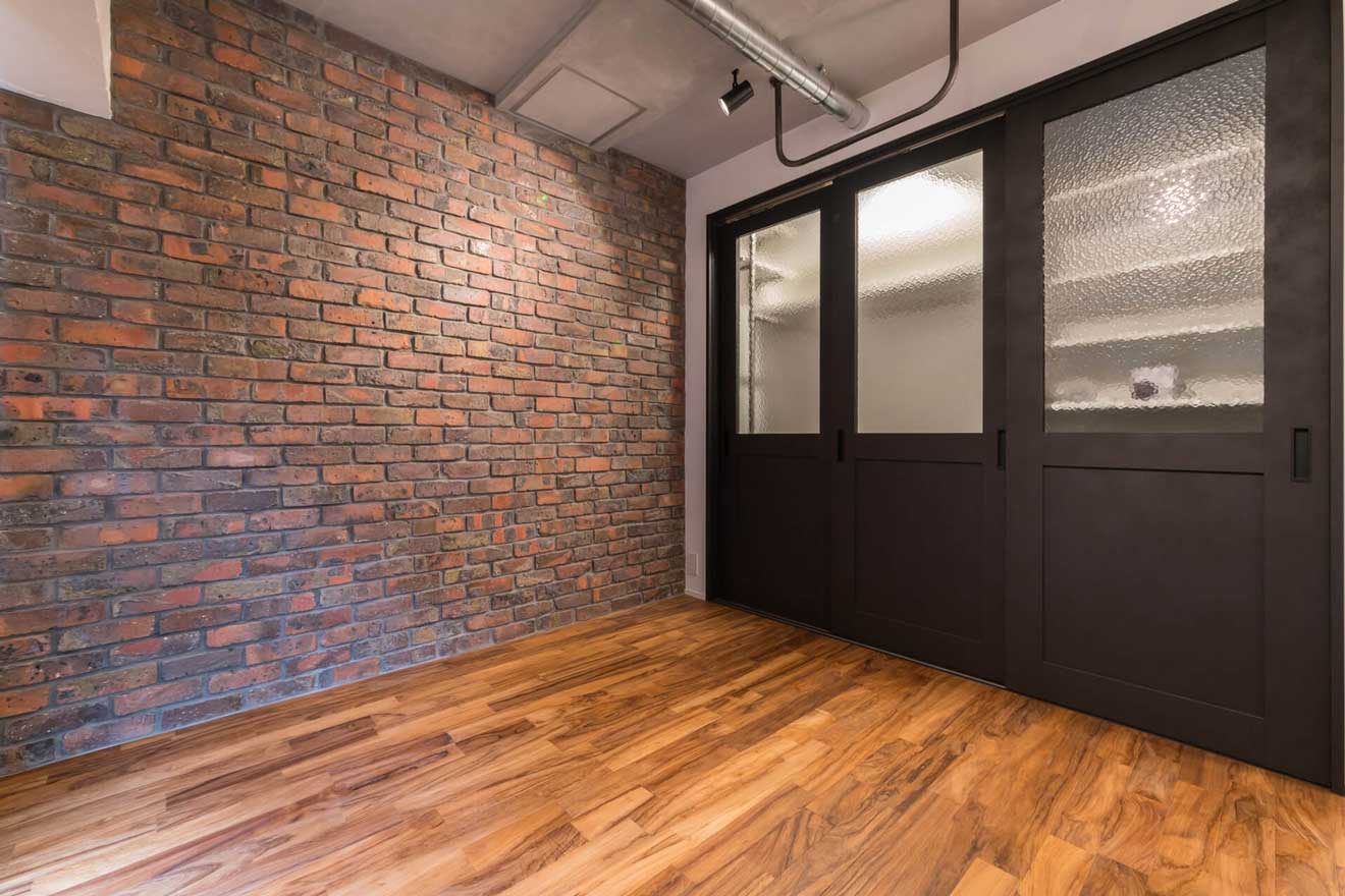 内装デザインの一押しは、本物のブロックを薄く削ったレンガタイルの壁。そのほかにも躯体に直接塗装を施したり、経年劣化で味わいが出てくるタイルや建具をチョイスしました。