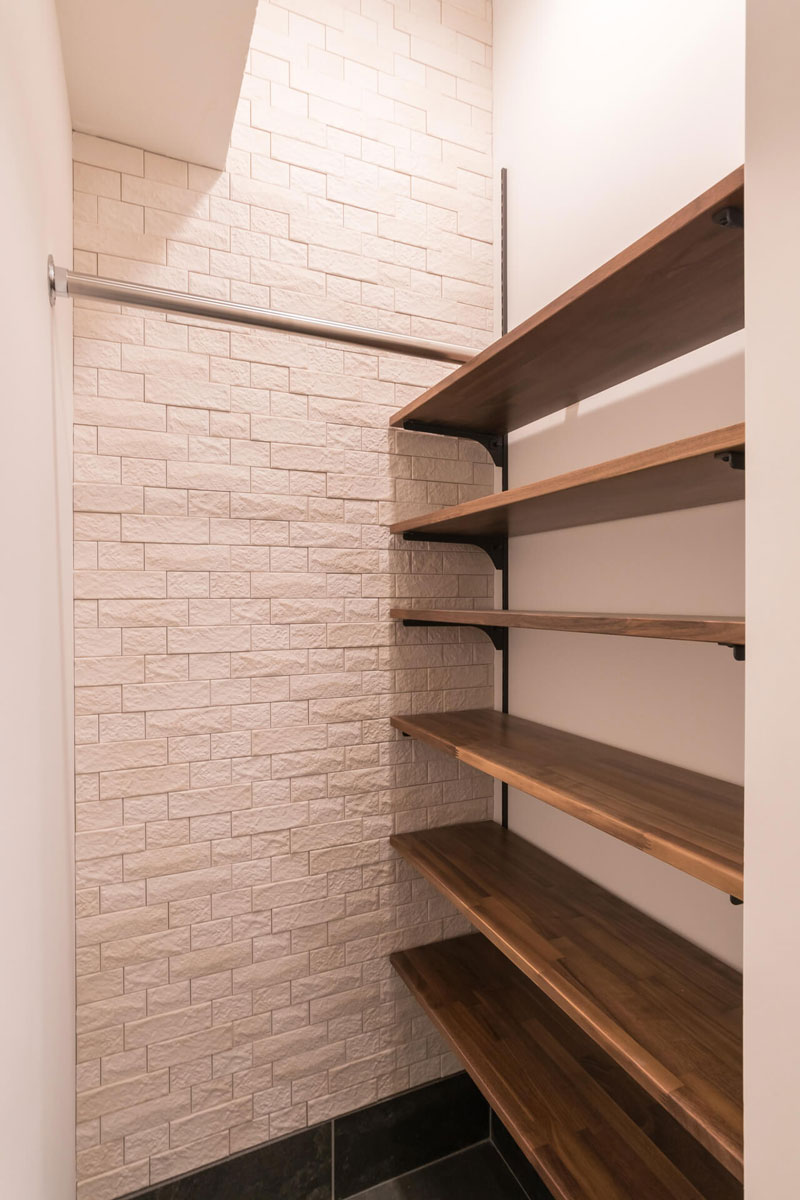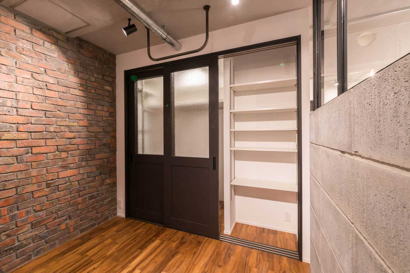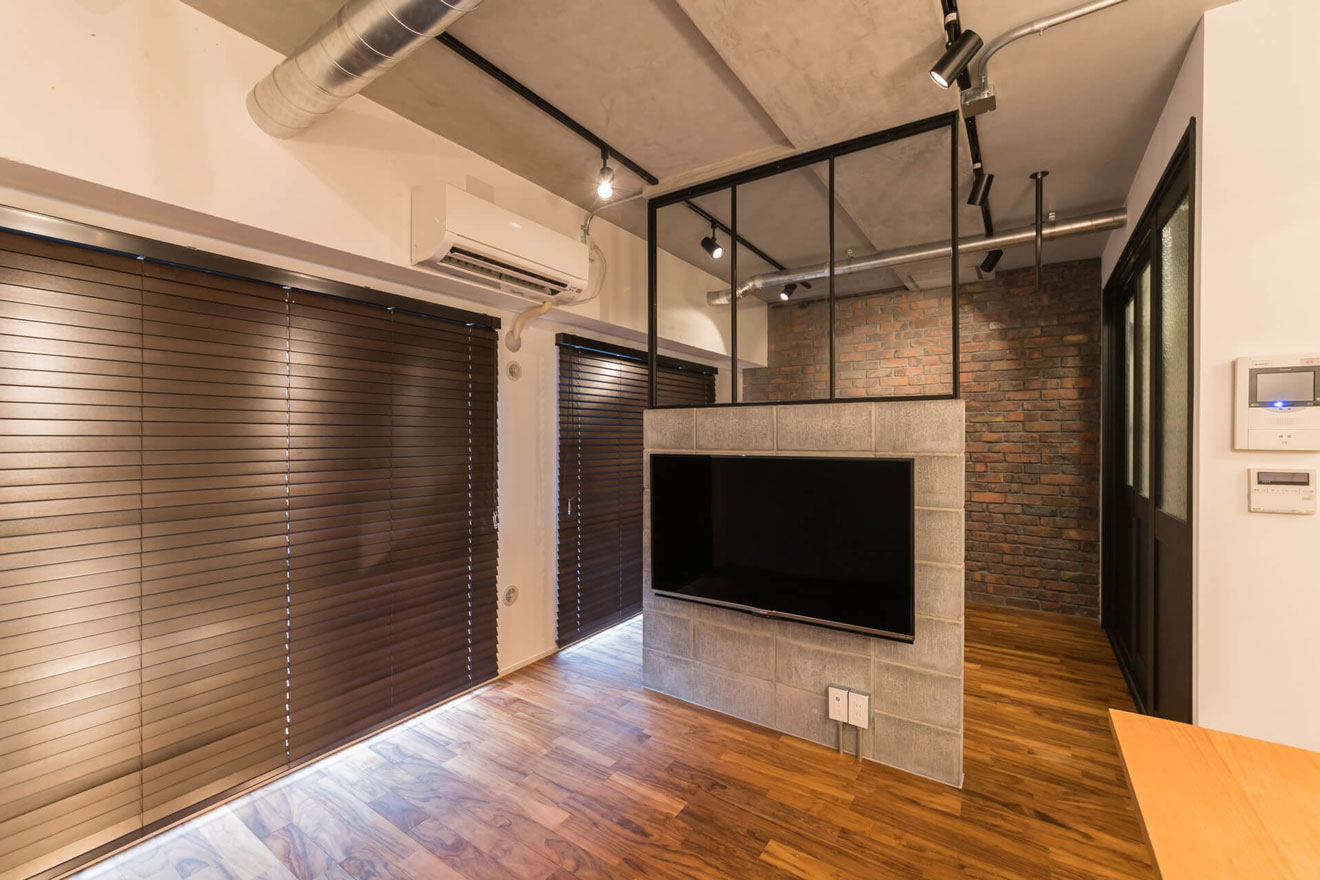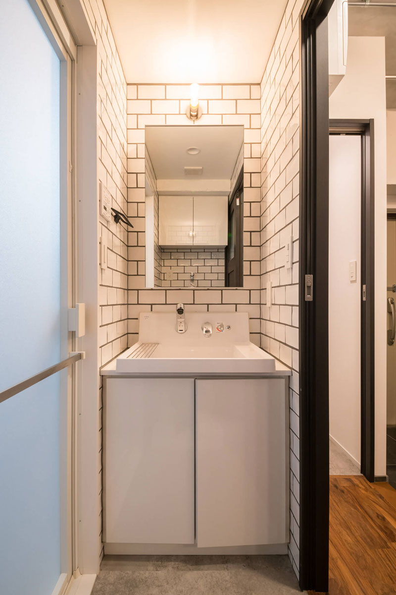 内装デザインの一押しは、本物のブロックを薄く削ったレンガタイルの壁。そのほかにも躯体に直接塗装を施したり、経年劣化で味わいが出てくるタイルや建具をチョイスしました。