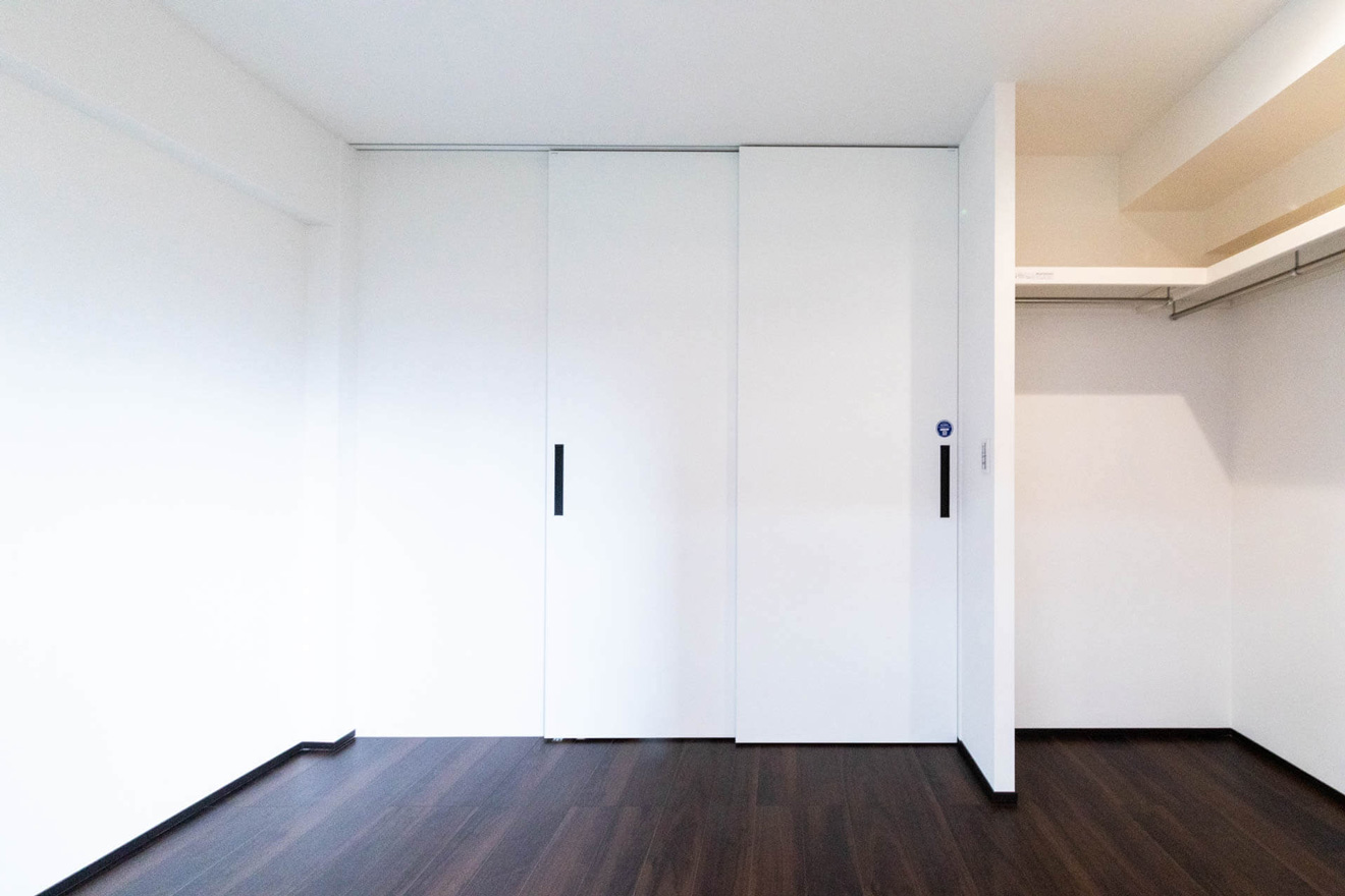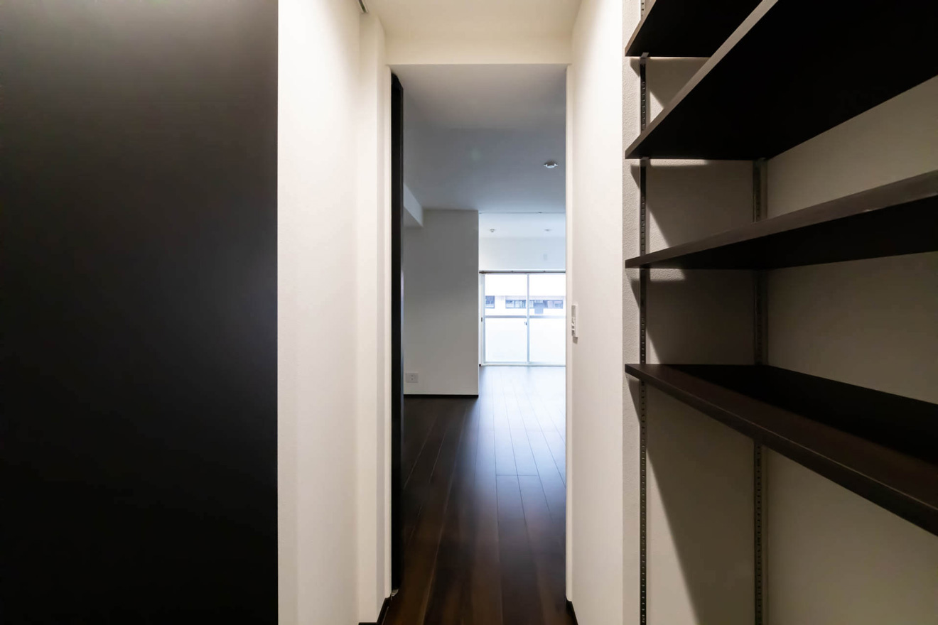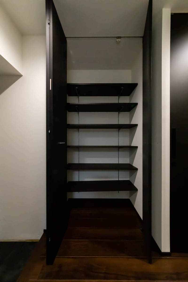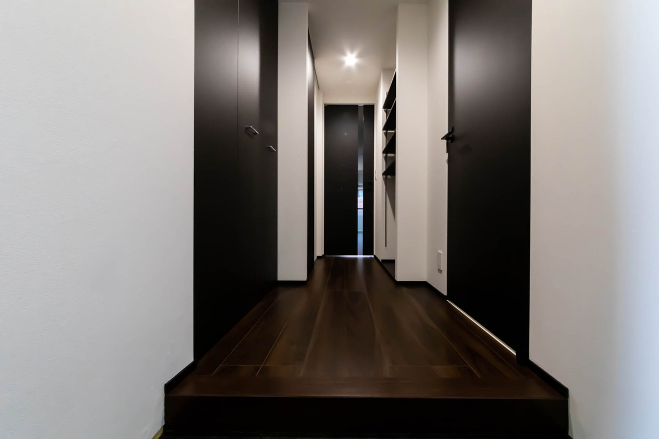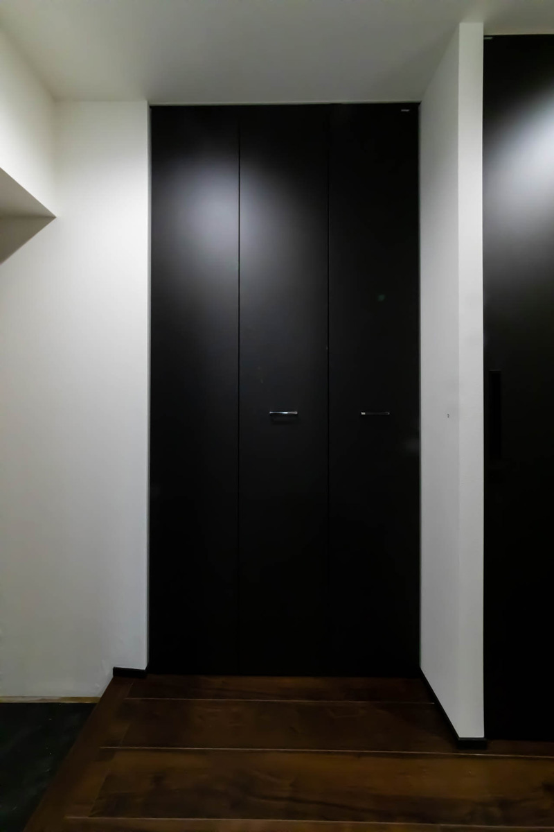 廊下には、収納スペースを取りました。ゴルフや野球道具を置くこともでき、すっきりとしたリビングと洋室との対比で、メリハリをつけました。