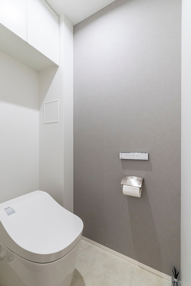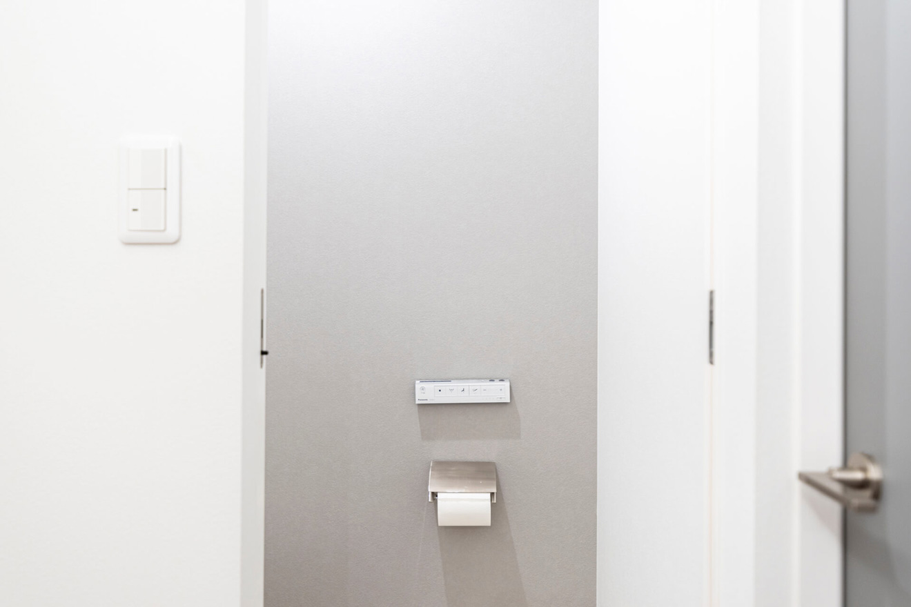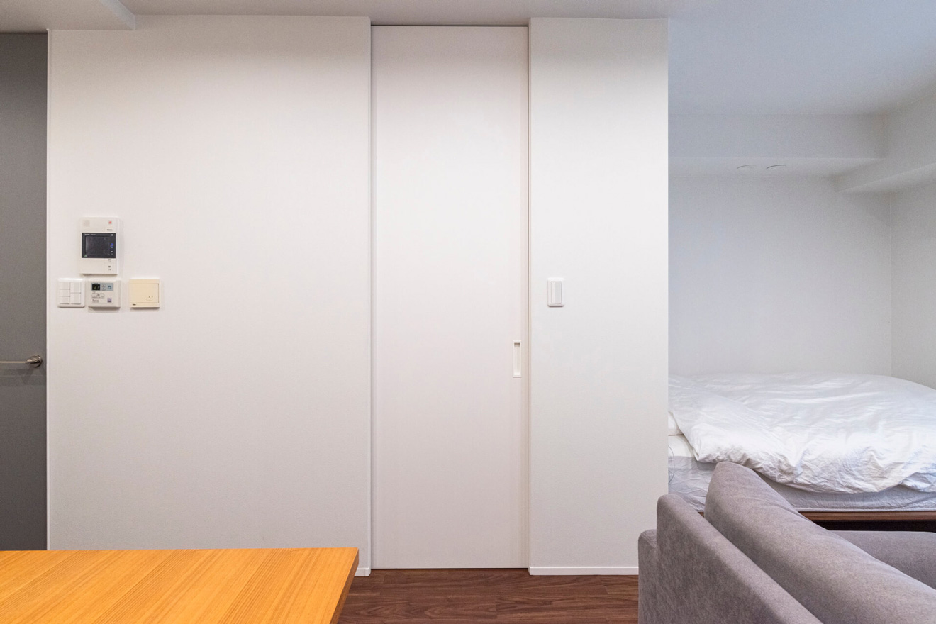 この角度からの眺めポイントは、天井高と同じグレーのハイドア。ハイドアはホールへと続きます。