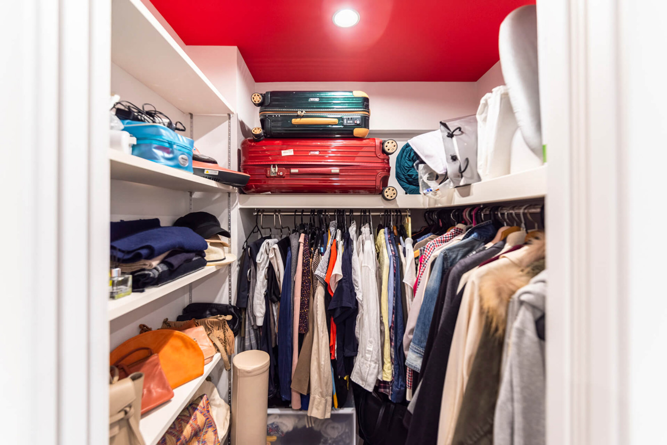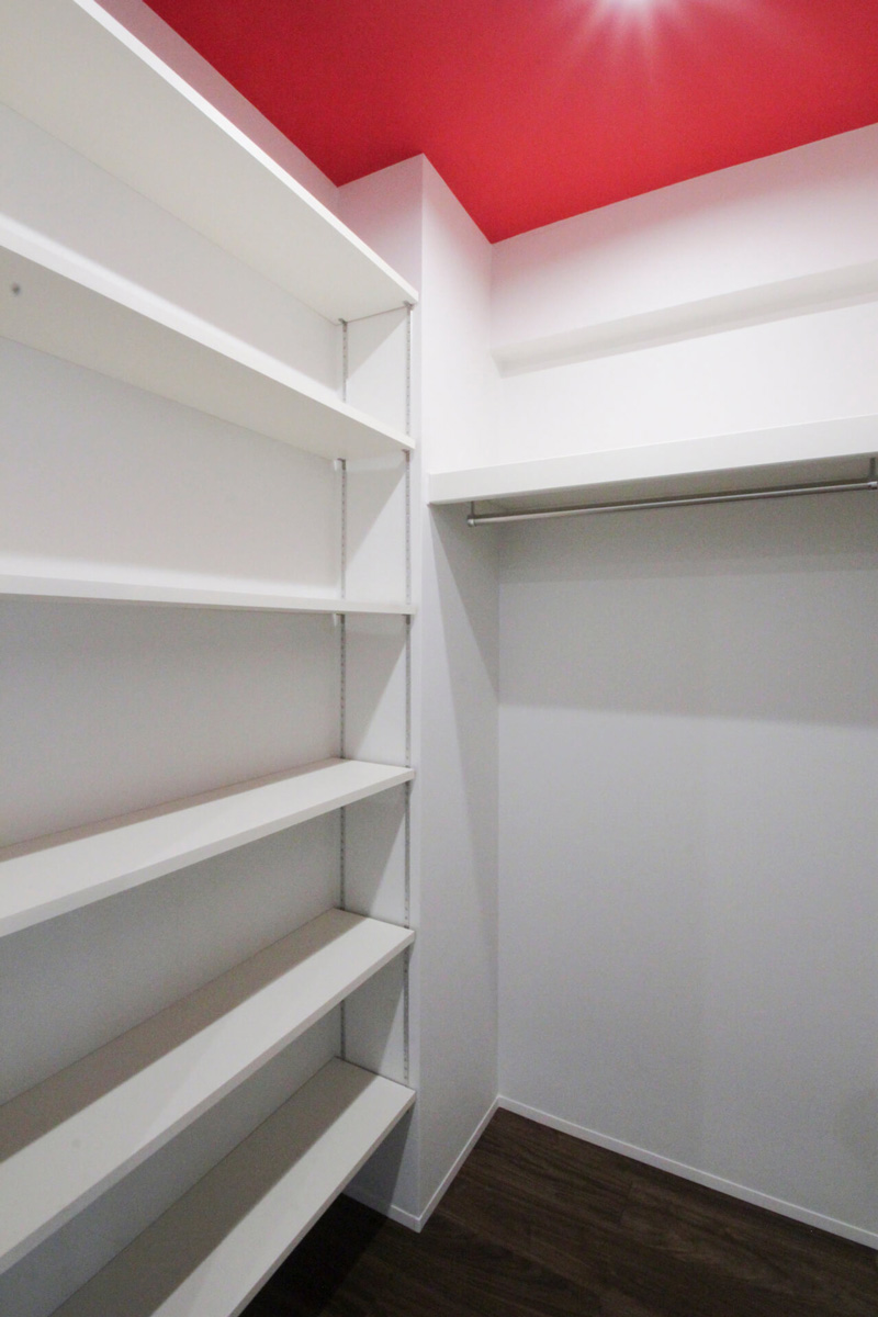 施主様のご希望で、ウォークインクローゼットの天井は赤!テンションがあがりますね。