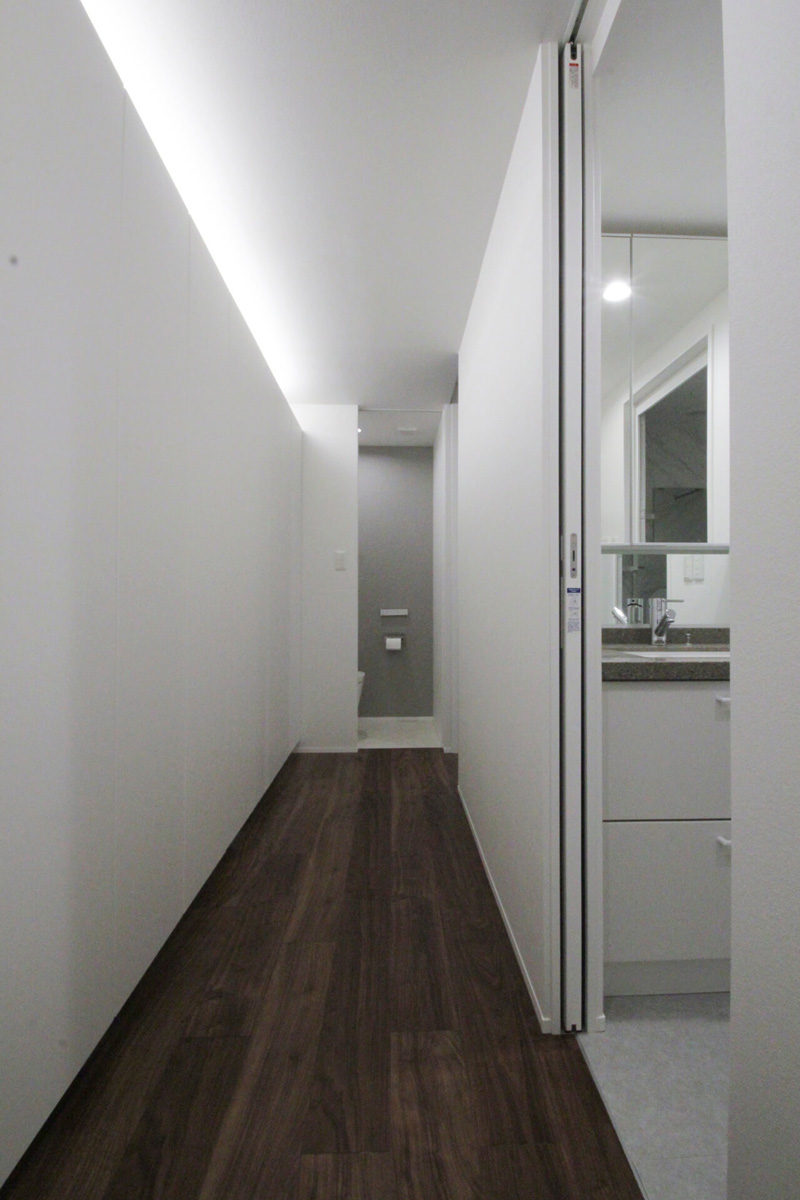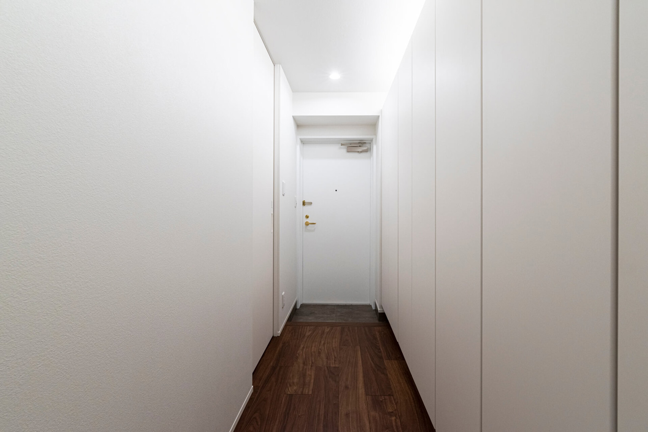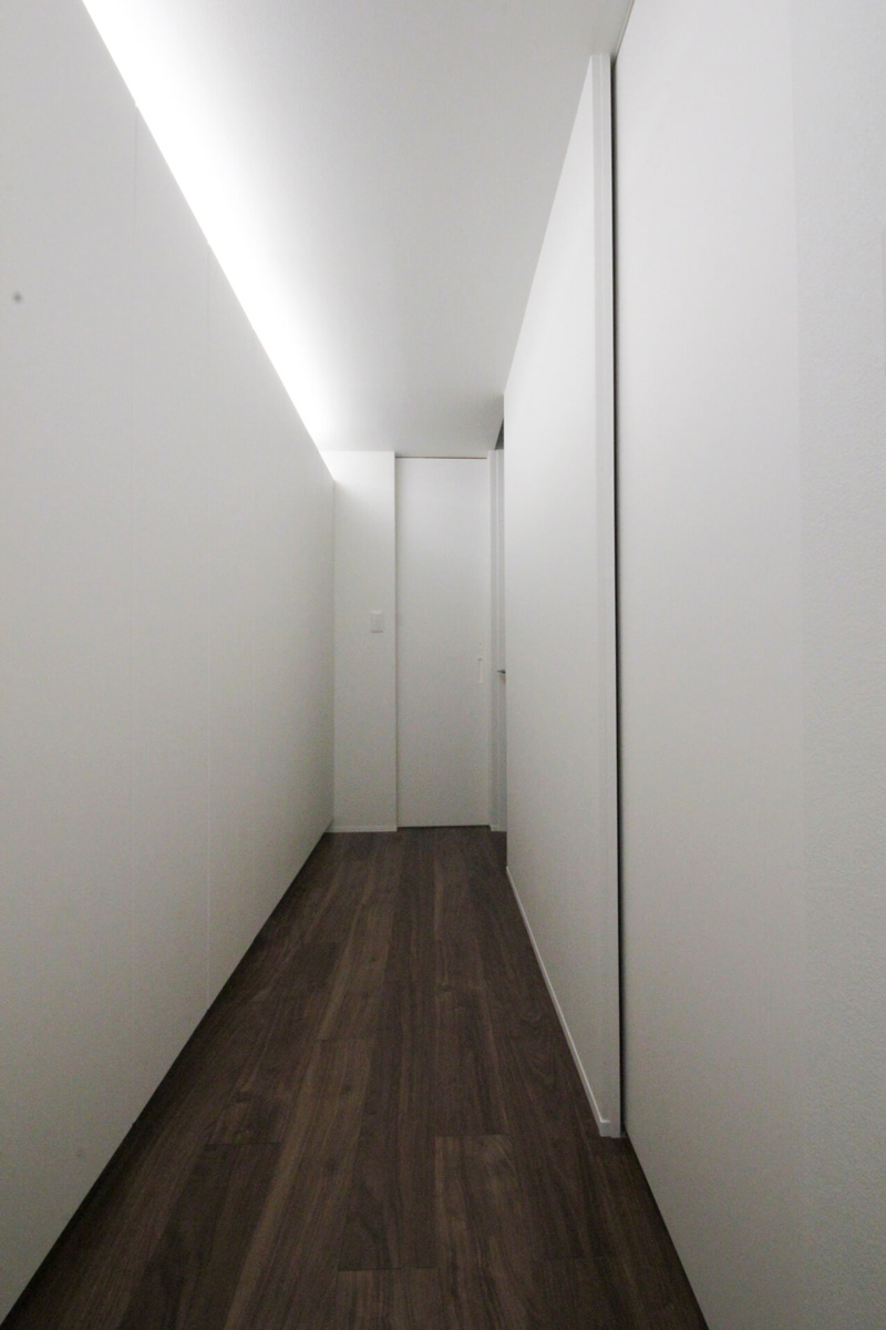 玄関へと続くスペースは、右にクローゼットが並びます。ここに収納を集めました。