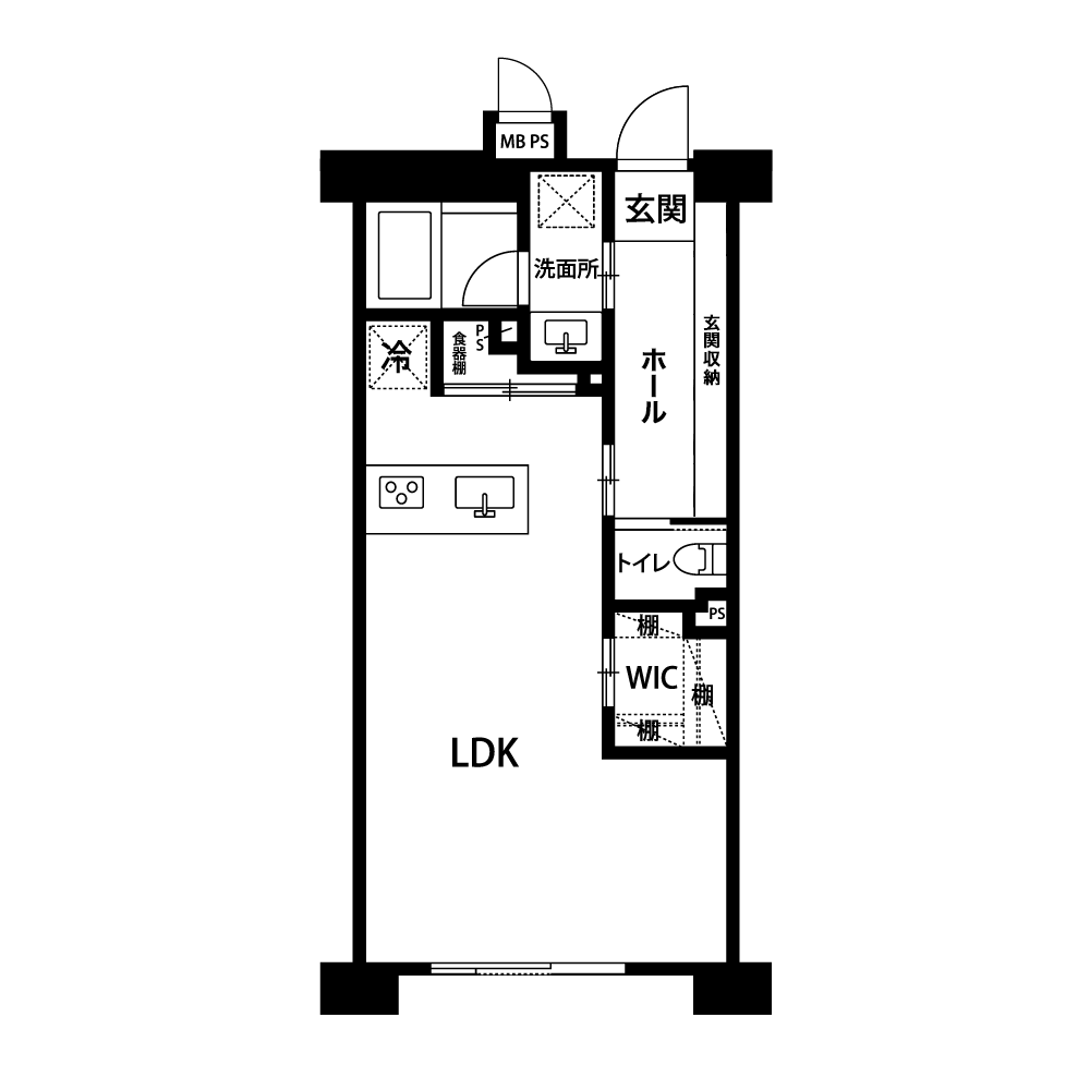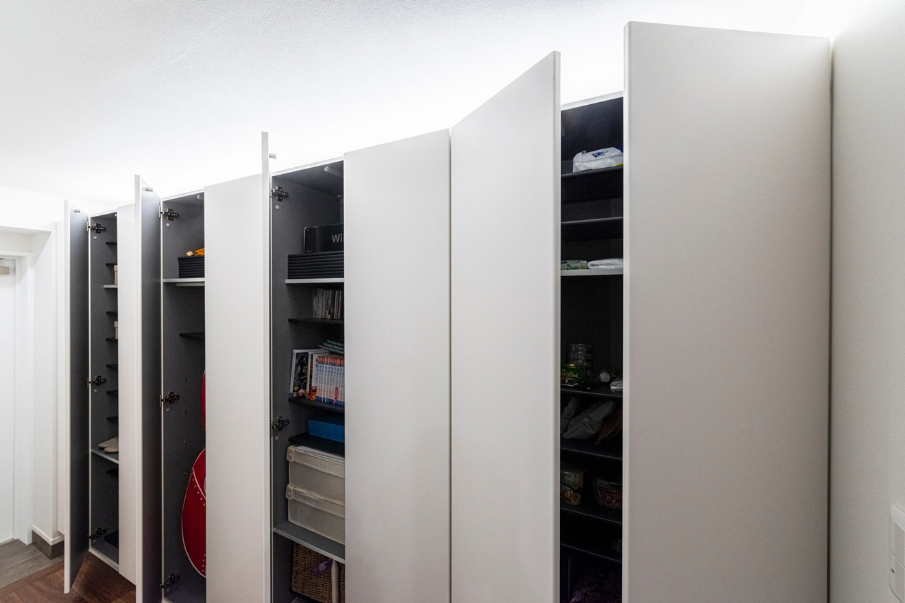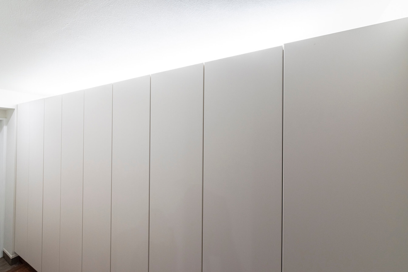 玄関へと続くスペースは、右にクローゼットが並びます。ここに収納を集めました。