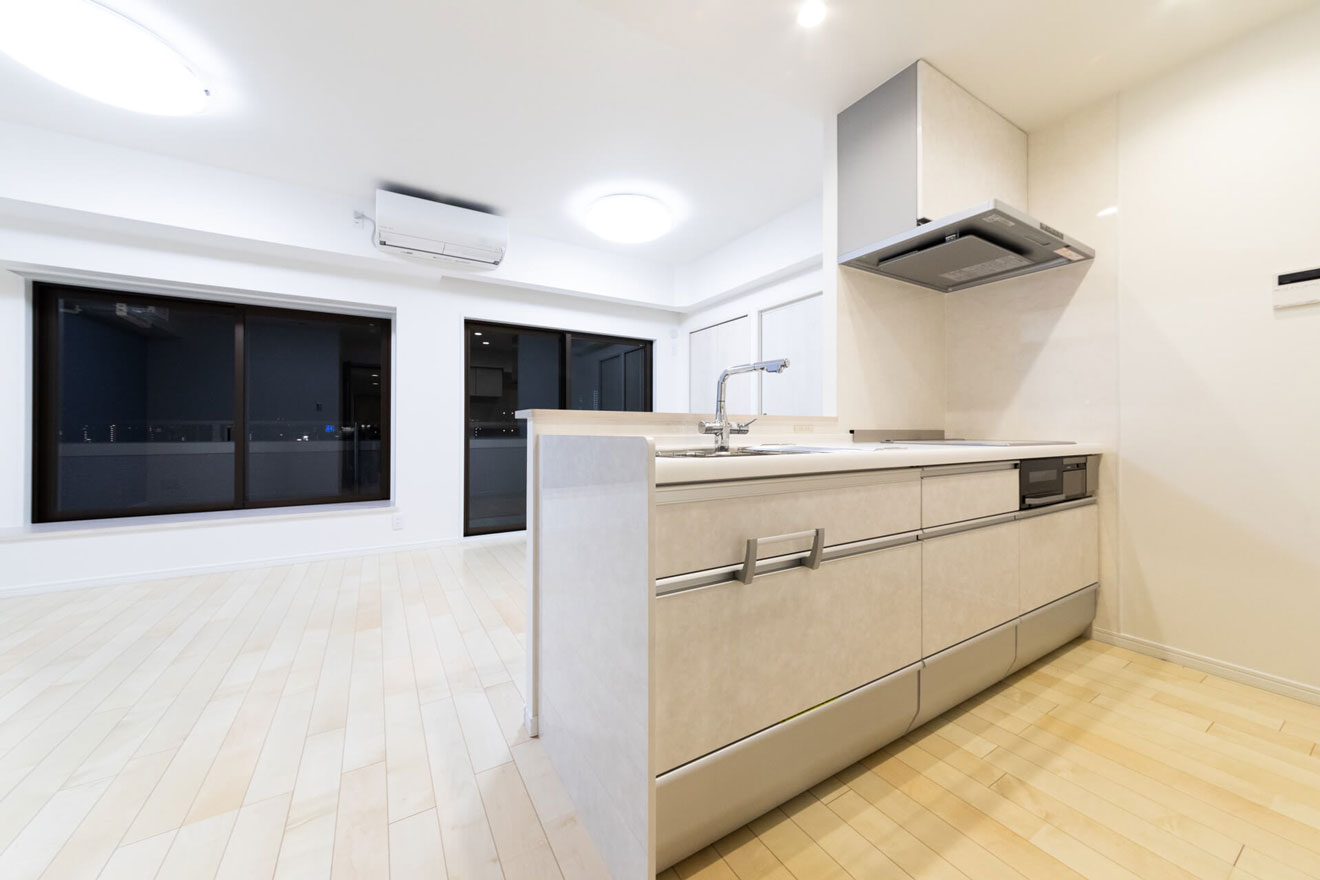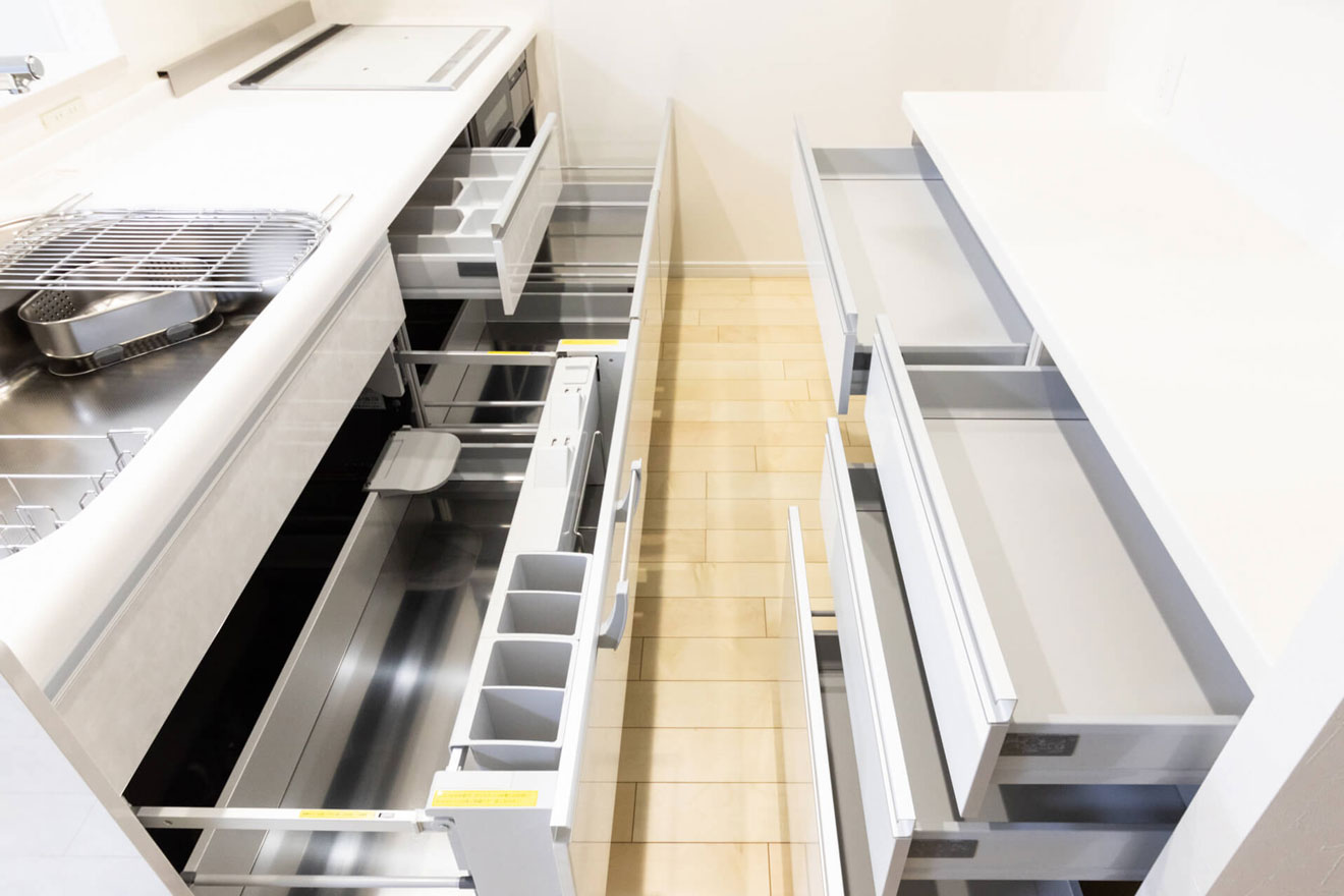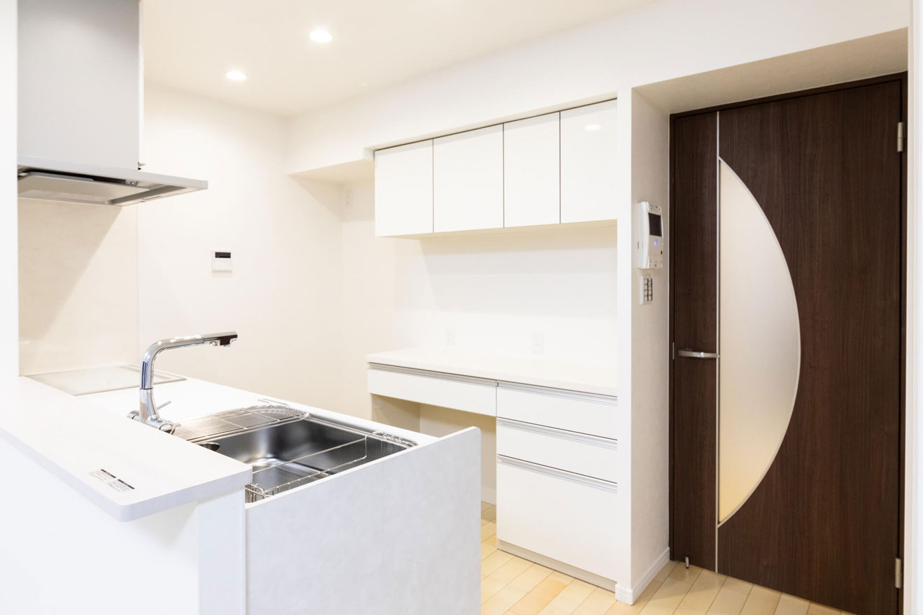 キッチンには、電化製品のサイズや設置時の制限を考慮した上で、無理なく収まる食器棚を設置。料理道具の出し入れのしやすさ・機能性を重視して、システムキッチンのグレードを決定されました。