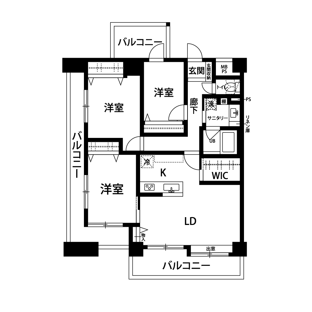 家具の配置がしやすい空間です。出窓の手前にソファを配置し、キッチンからダイニングへ、そしてベランダへの導線を確保。