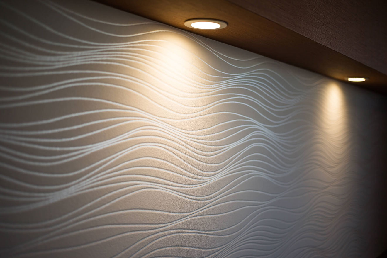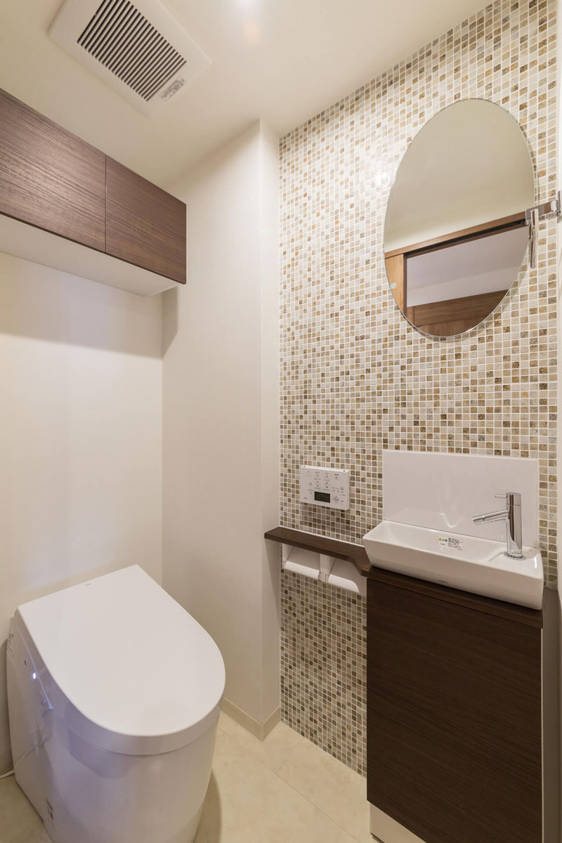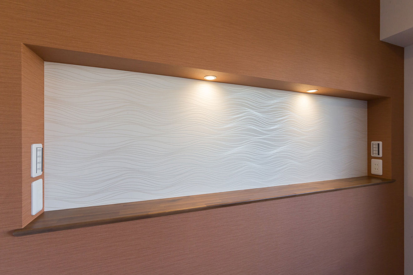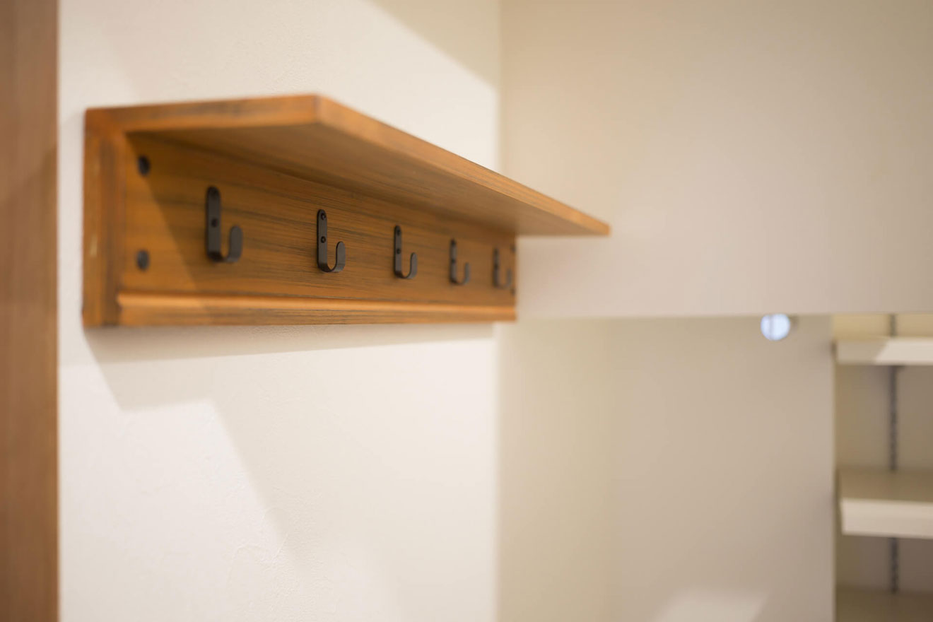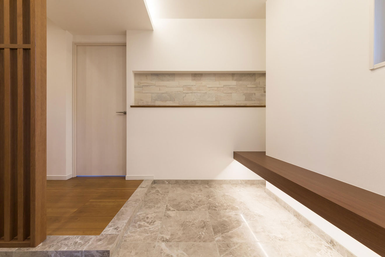 ベンチは、下からの間接照明で雰囲気のある空間を演出。もちろん靴を履いたり脱いだりする機能性もあります。たっぷりと面積をとったシューズインクロークも用意し、お二人の家の顔となる玄関は、ゆとりを感じる上質で落ち着いた空間になりました。