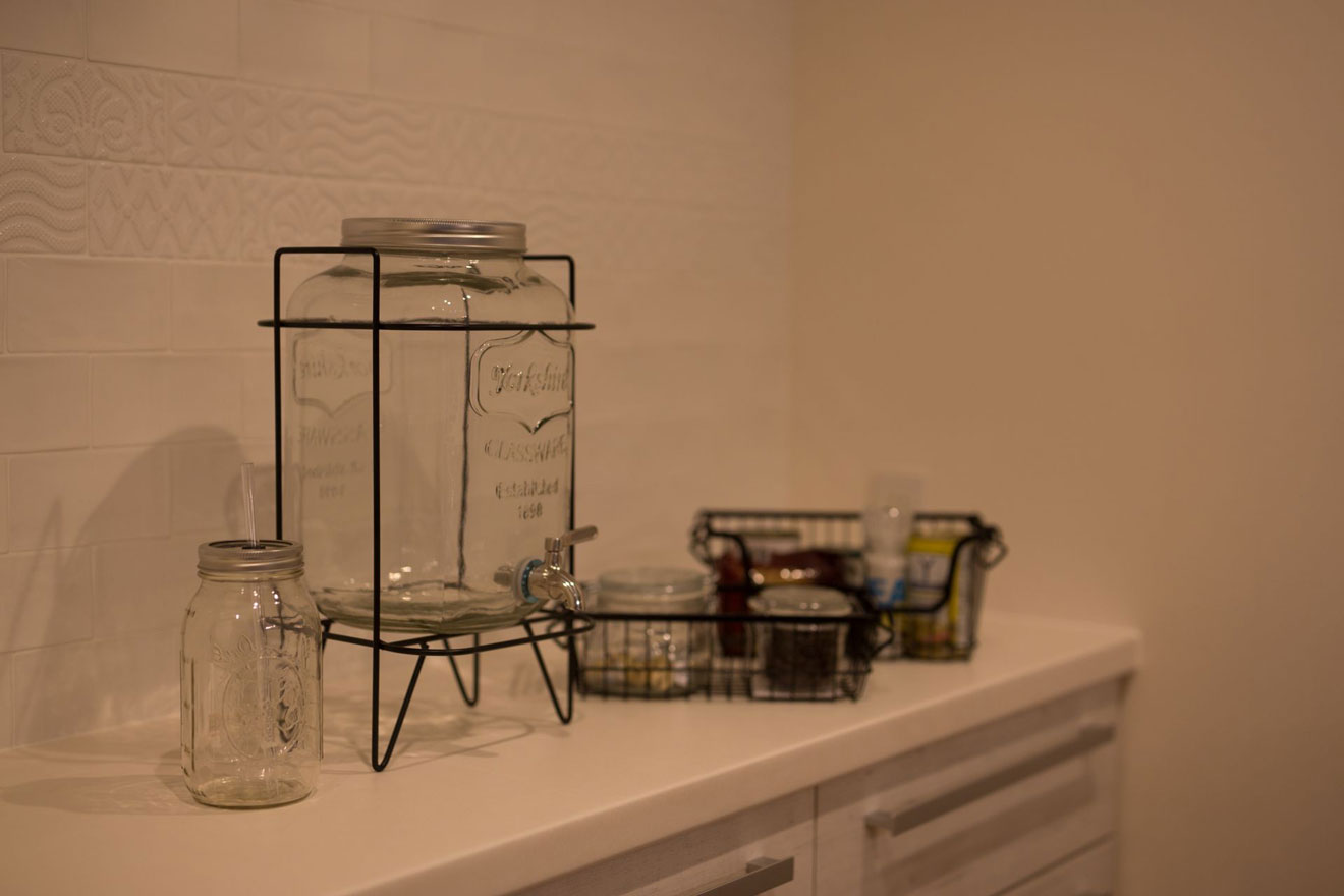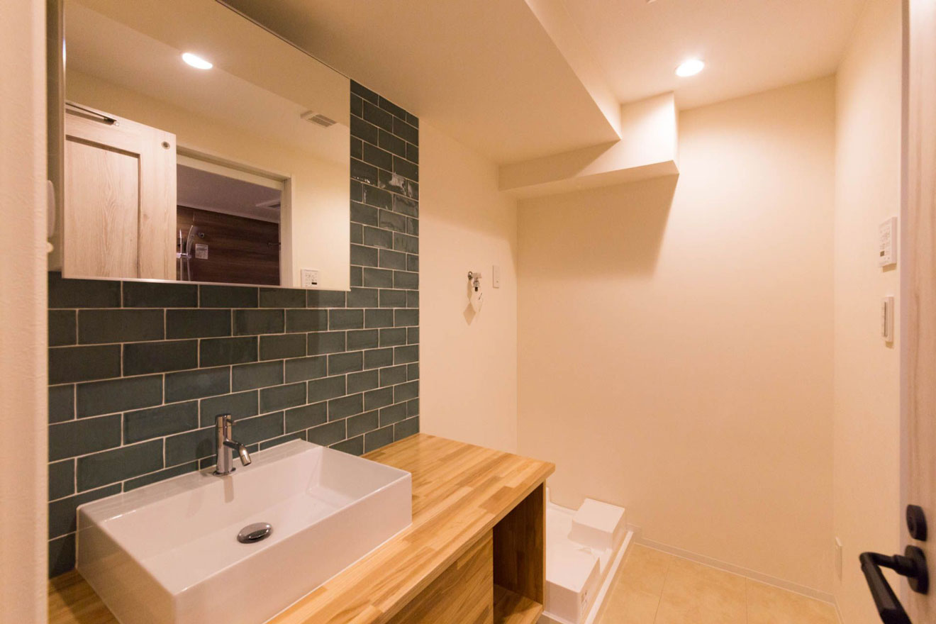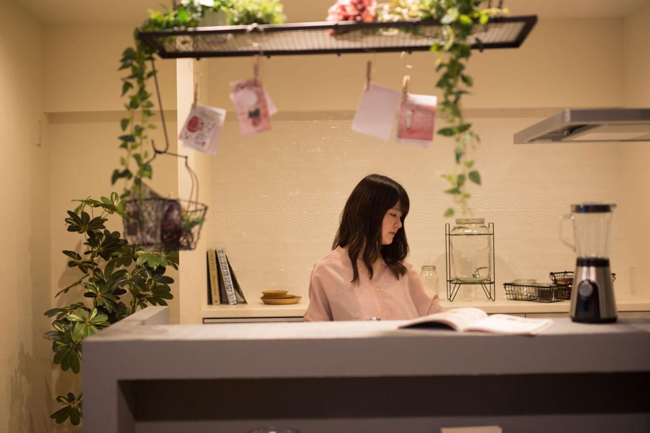 室内に設けられた窓からは洋室内にやわらかな光と風を届けてくれます。廊下を抜けてリビングへとつづくナチュラルグリーンの扉を開けると、モルタル調のカウンター収納がアクセントとなっている広いダイニングスペースが現れます。