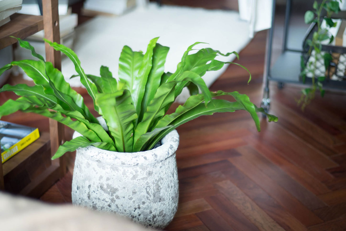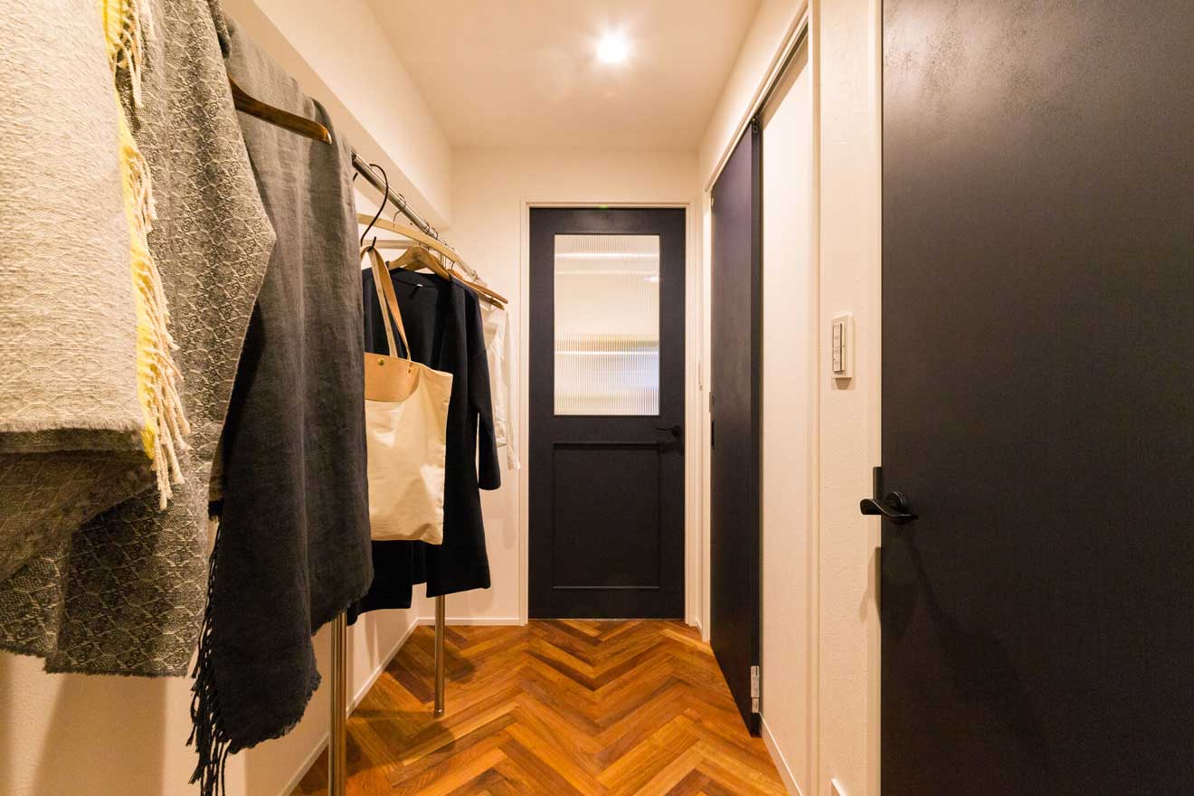 玄関を開けると廊下の壁面にはオープンクローゼットが広がり、限られた空間を有効利用しています。 床材に用いているカリンのヘリンボーンが自然木の美しさを際立てます。