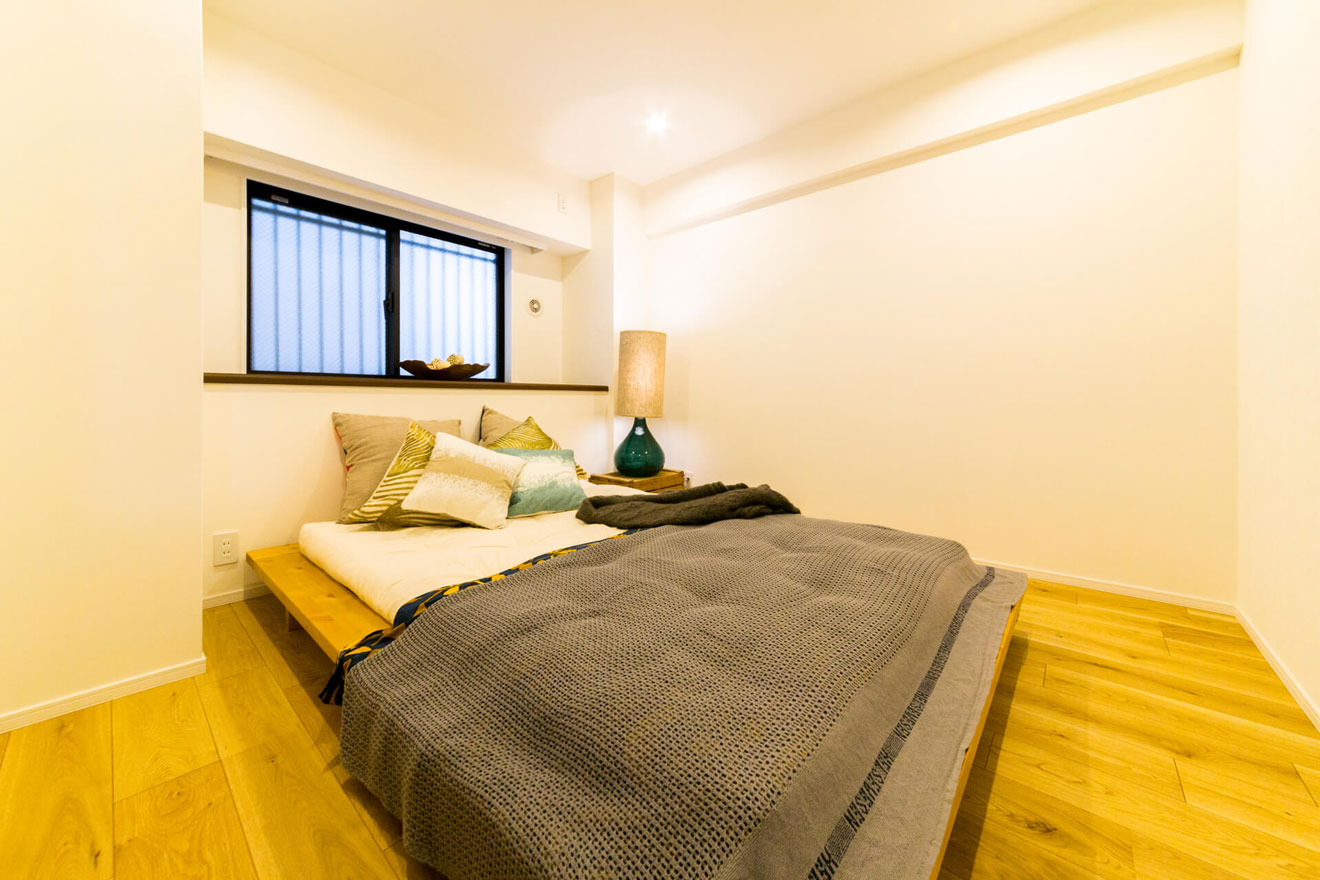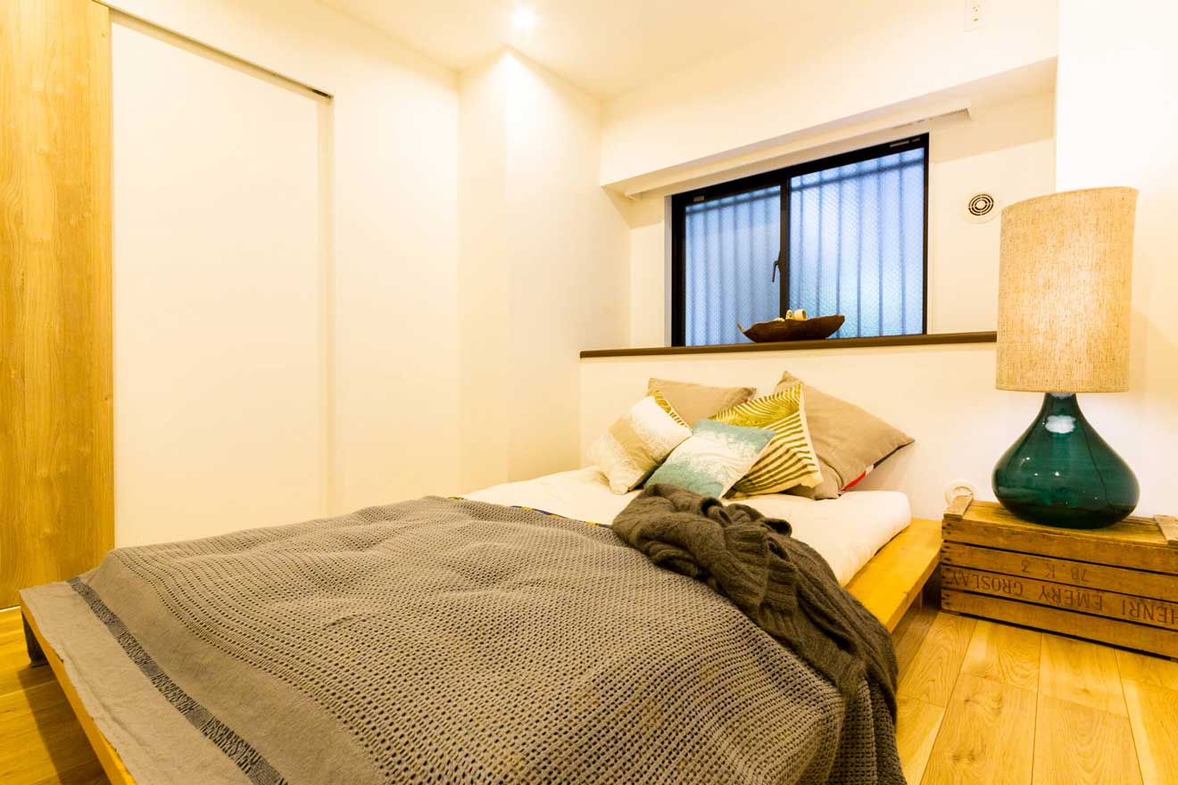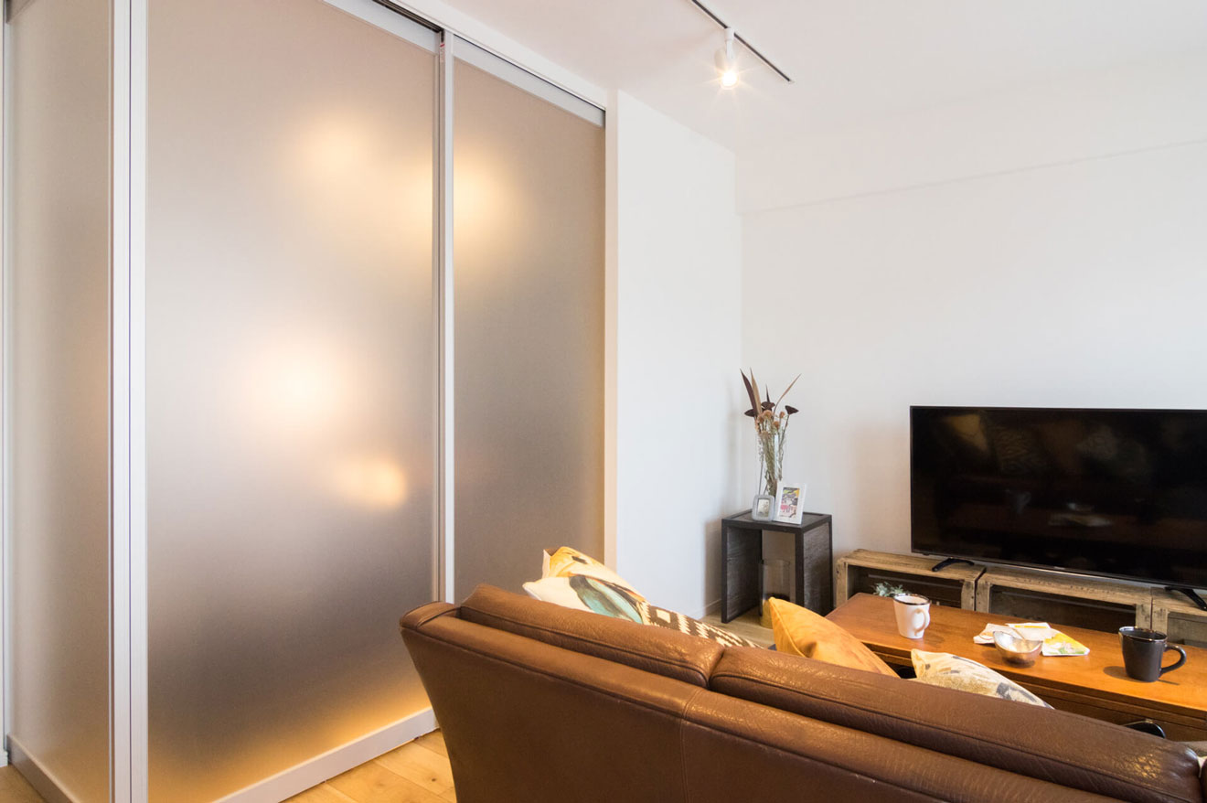 家づくりのコンセプトは住み替えが容易に出来ること。売却しやすく貸しに出しやすいよう配慮する必要もあり、飽きのこないシンプルな間取りに、万人受けするデザインを採用しました。間仕切りにすりガラスを使用することで、閉めても圧迫感はなく、ほんのり灯りと気配を感じる仕様に。