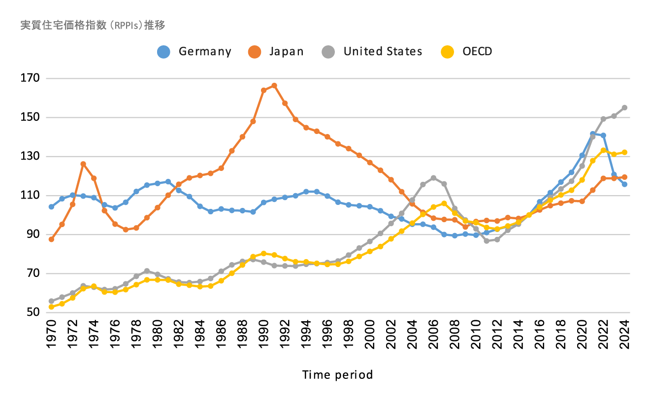 経済協力開発機構(OECD)の住宅価格指数の長期推移を確認してみると、日本は1991年をピークに住宅価格が下落し、2012年のアベノミクス以降緩やかに上昇。そして2020年の新型コロナウイルス流行および2022年のロシアによるウクライナ侵攻以来、高騰傾向となっています。OECD諸国平均では短期的な増減はありつつも長期的に上昇していることがわかります。2022年以降の波は日本と同じ形を描いています。ただOECD平均と比べると上昇率は低いです。アメリカは上昇を続けていて、ドイツは2022年以降は減少傾向となっています。