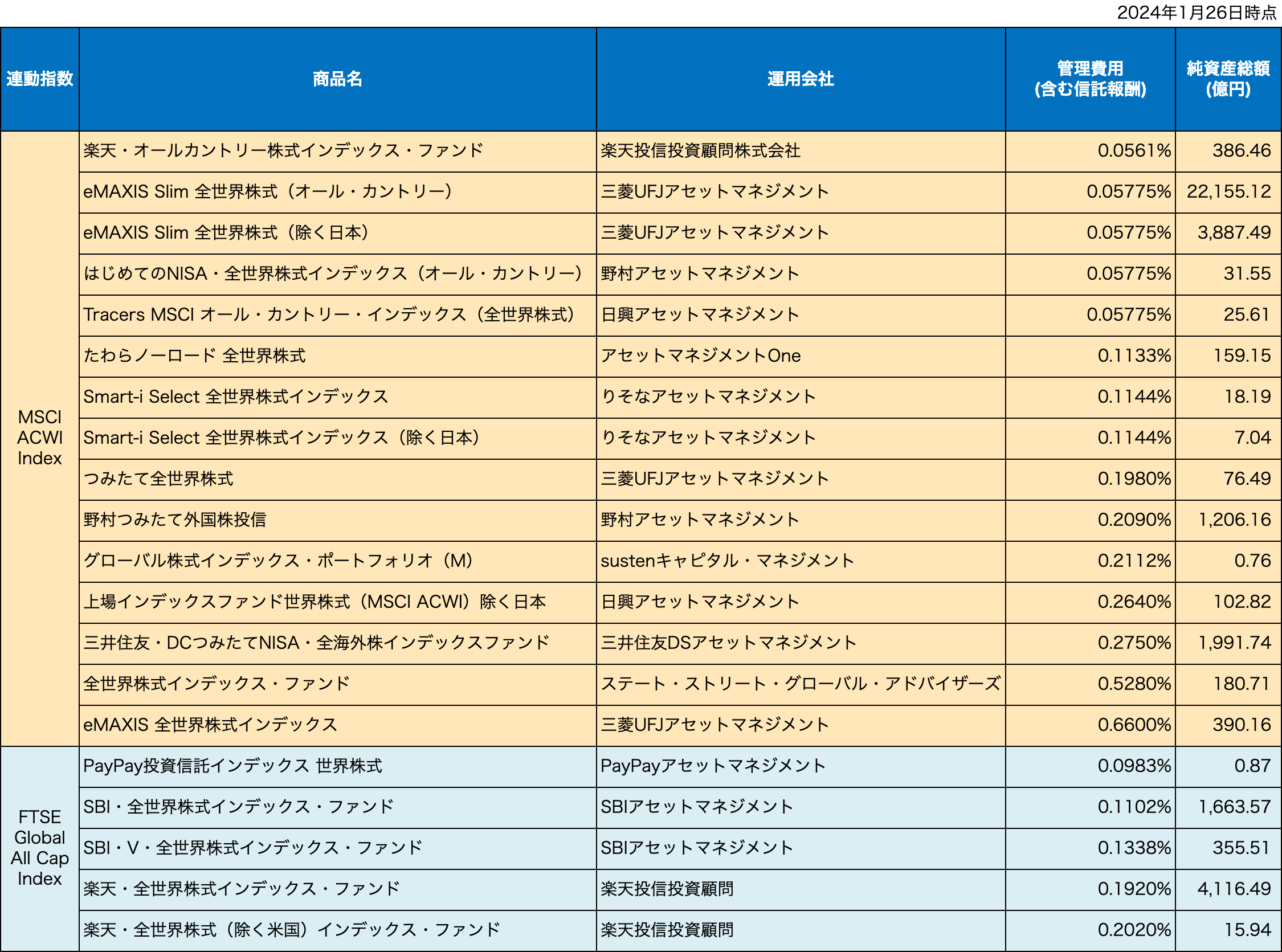 <新NISA「つみたて投資枠」の全世界株式インデックスファンド一覧>