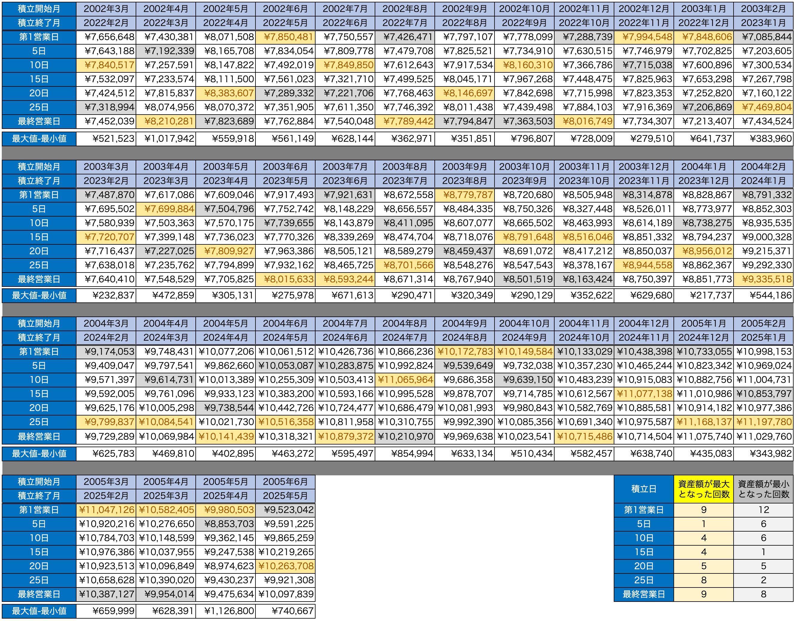 表が細かくて恐縮ですが、先ほどと同じく、黄色が「資産額が一番多い積立日」、灰色が「資産額が一番少ない積立日」です。観測時期を変えることで、資産額が最大(または最小)となる積立日がバラつくことがわかりました。