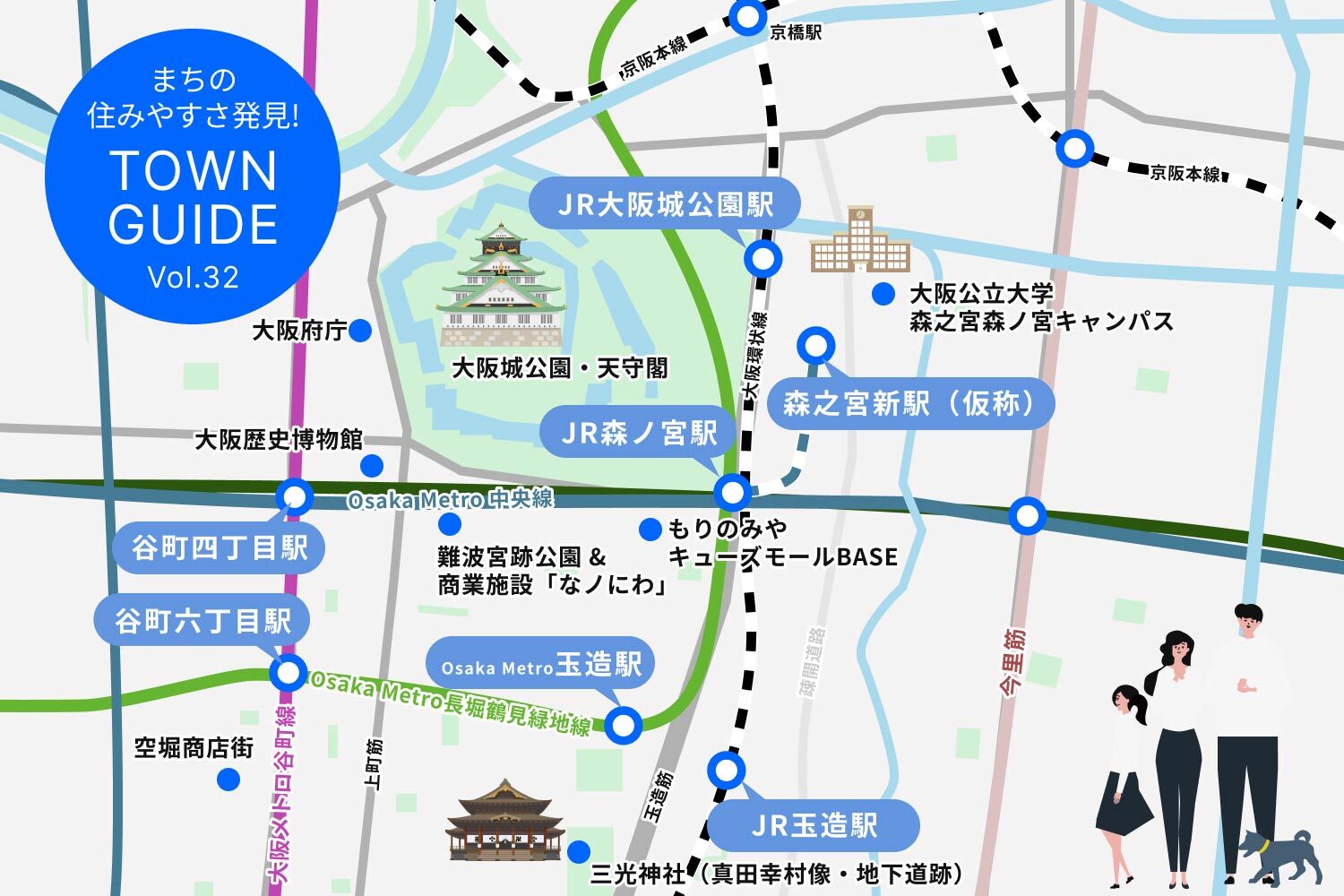 「キタ」「ミナミ」の南北軸を中心に発展してきた大阪。近年、東西軸での広がりが構想される中、注目を集めるのが「ヒガシ」エリアです。上町台地の高台に位置し、大阪城公園という都心では貴重な緑地に隣接します。歴史や自然を感じる環境に加え、谷町筋沿いや玉造・森ノ宮にかけては商店街や個性あるショップが並び、日常の買い物から散策まで楽しめます。さらに2025年には大阪公立大学森之宮キャンパスが開設し、新駅整備とあわせて新たなにぎわいの創出も期待されています。交通利便性の高さも相まって、都市の暮らしやすさと未来への可能性が調和するエリアです。